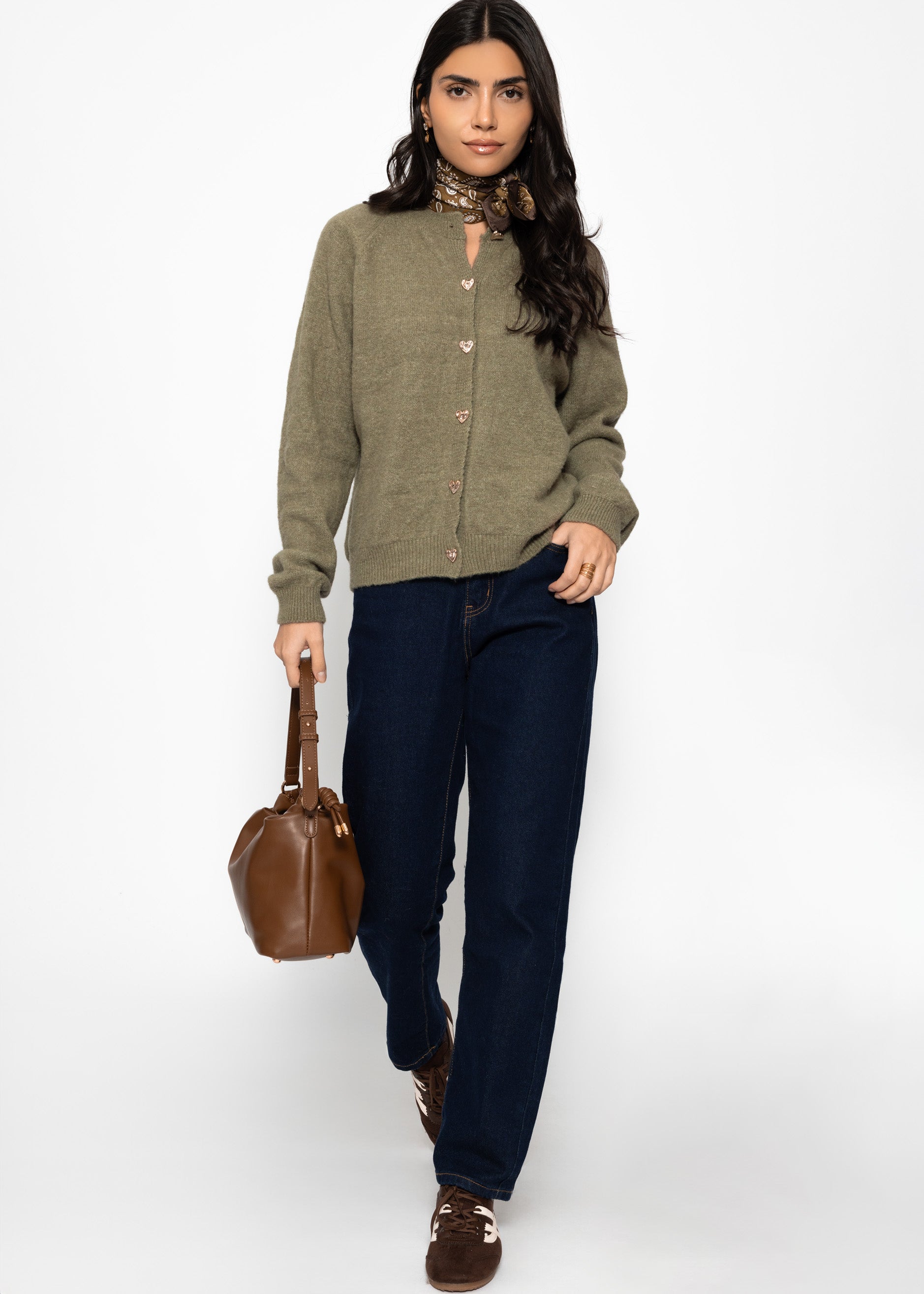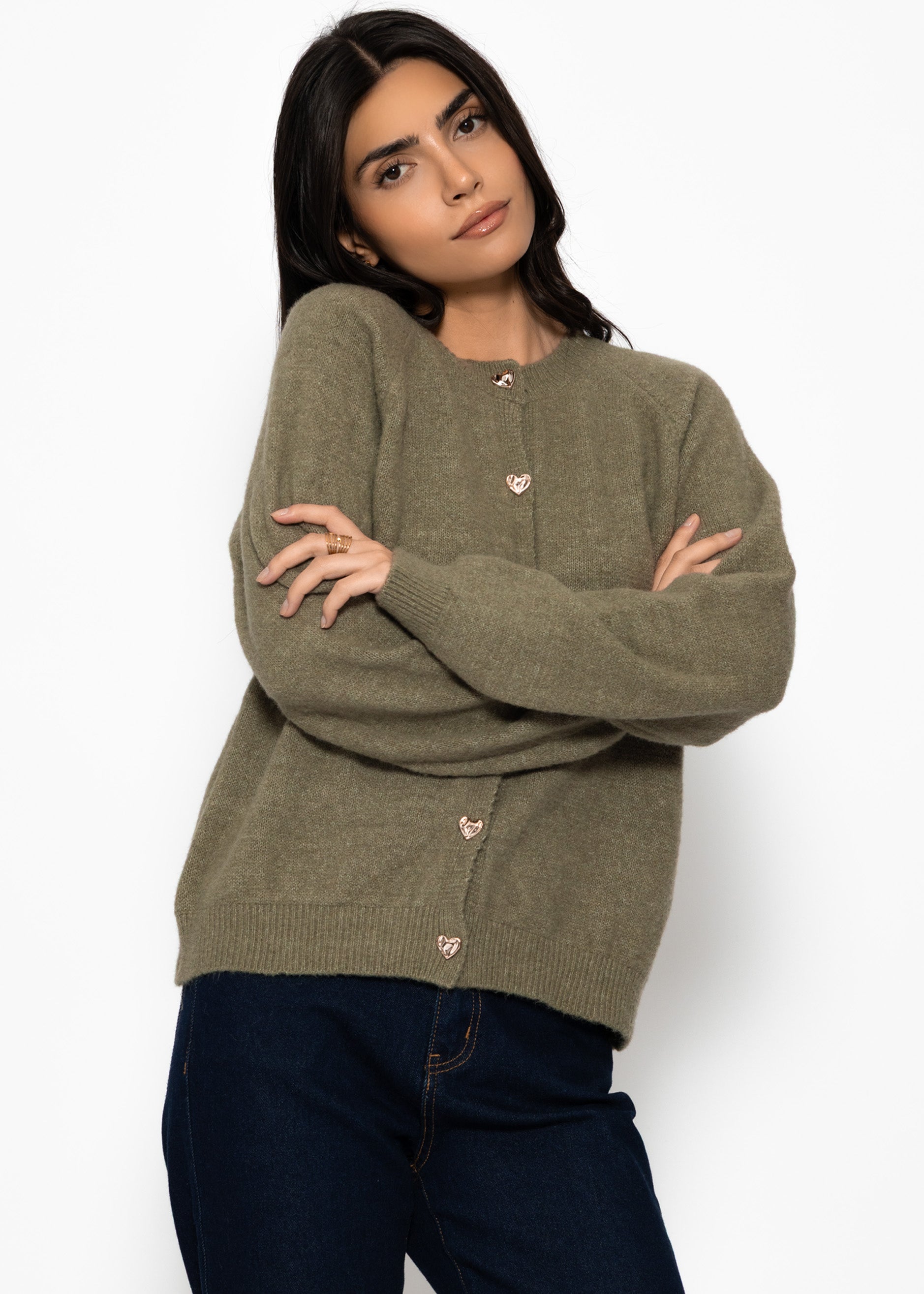 Cardigan mit dekorativen, herzförmigen Knöpfen entlang der Front. Weicher Feinstrick mit klassischen Rippbündchen an Ärmeln und Saum. Lockerer Schnitt für einen gemütlichen, vielseitigen Look.