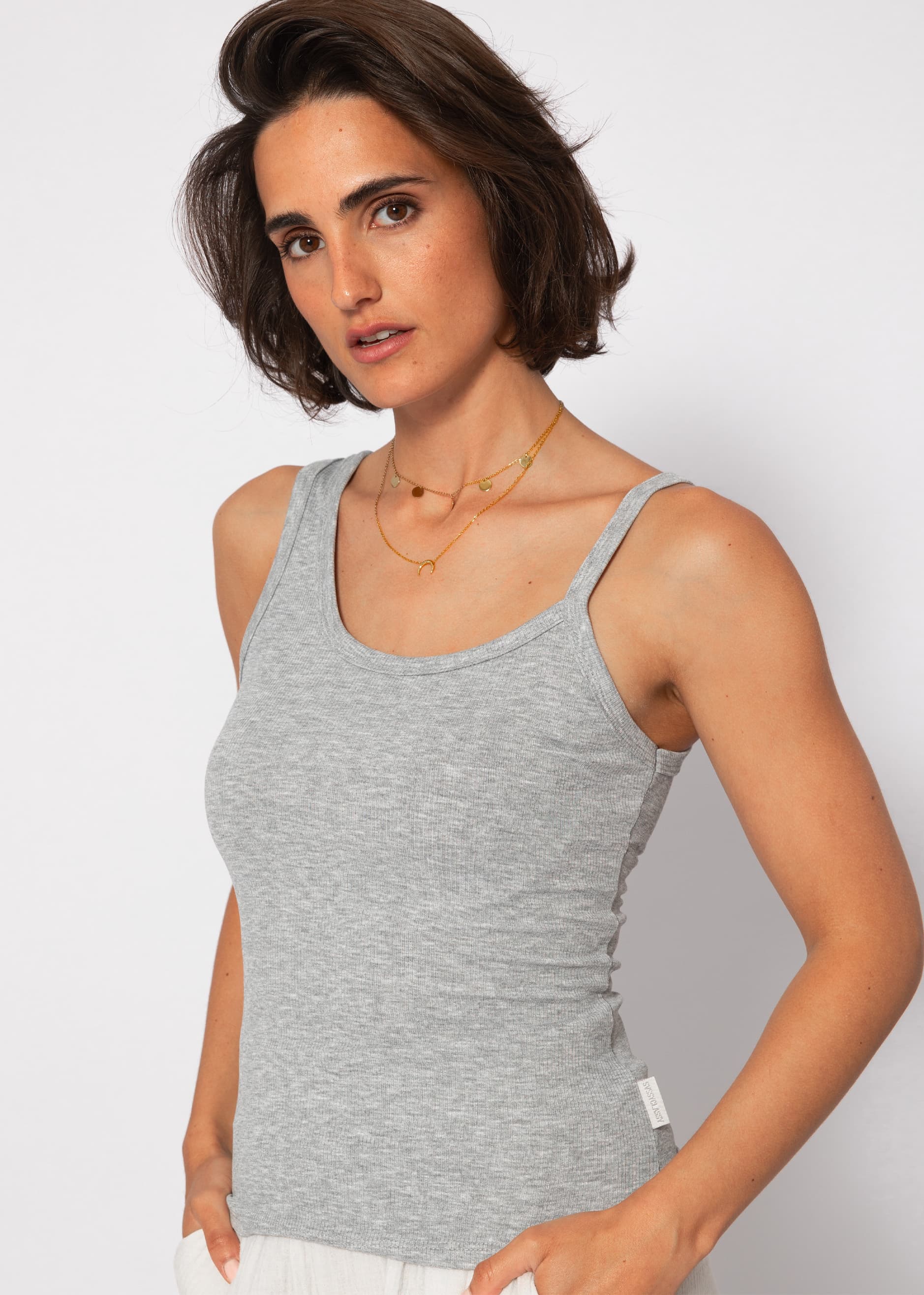 This stylish tank top is an essential basic for your wardrobe. Made from a high-quality, soft and stretchy viscose blend, it offers optimum comfort and a figure-hugging fit. The fine ribbed structure gives the top a subtle texture and makes it versatile, whether worn casually with jeans or elegantly under a blazer. The asymmetric cut gives the top a modern and unique look that perfectly accentuates your silhouette. Discreet branding at the hem adds a subtle accent and underlines the high quality of this design.