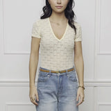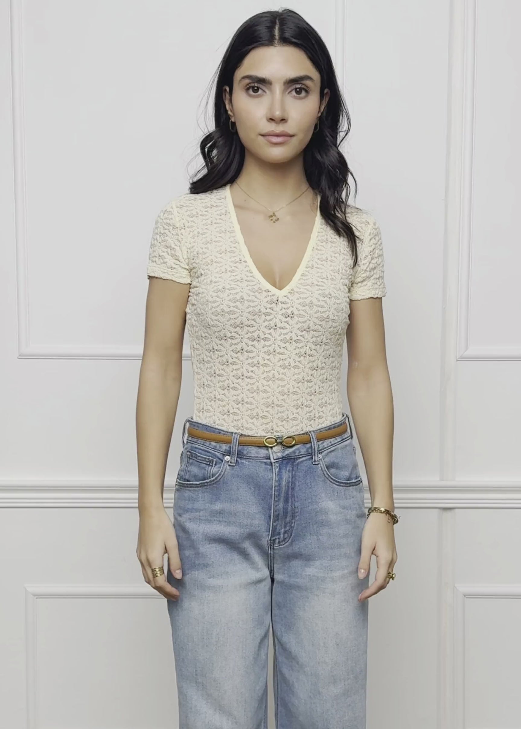 Delicate short-sleeved bodysuit in buttery yellow floral lace. The figure-hugging cut features a deep V-neck and short sleeves for an elegant silhouette. The fine all-over lace pattern creates a romantic and stylish look.