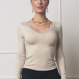 Beige long-sleeved shirt with an elegant lace neckline for a feminine, timeless look. The delicate lace adds a stylish accent and lends a special touch to the simple design. Ideal for elegant everyday outfits or as a sophisticated basic to mix and match.