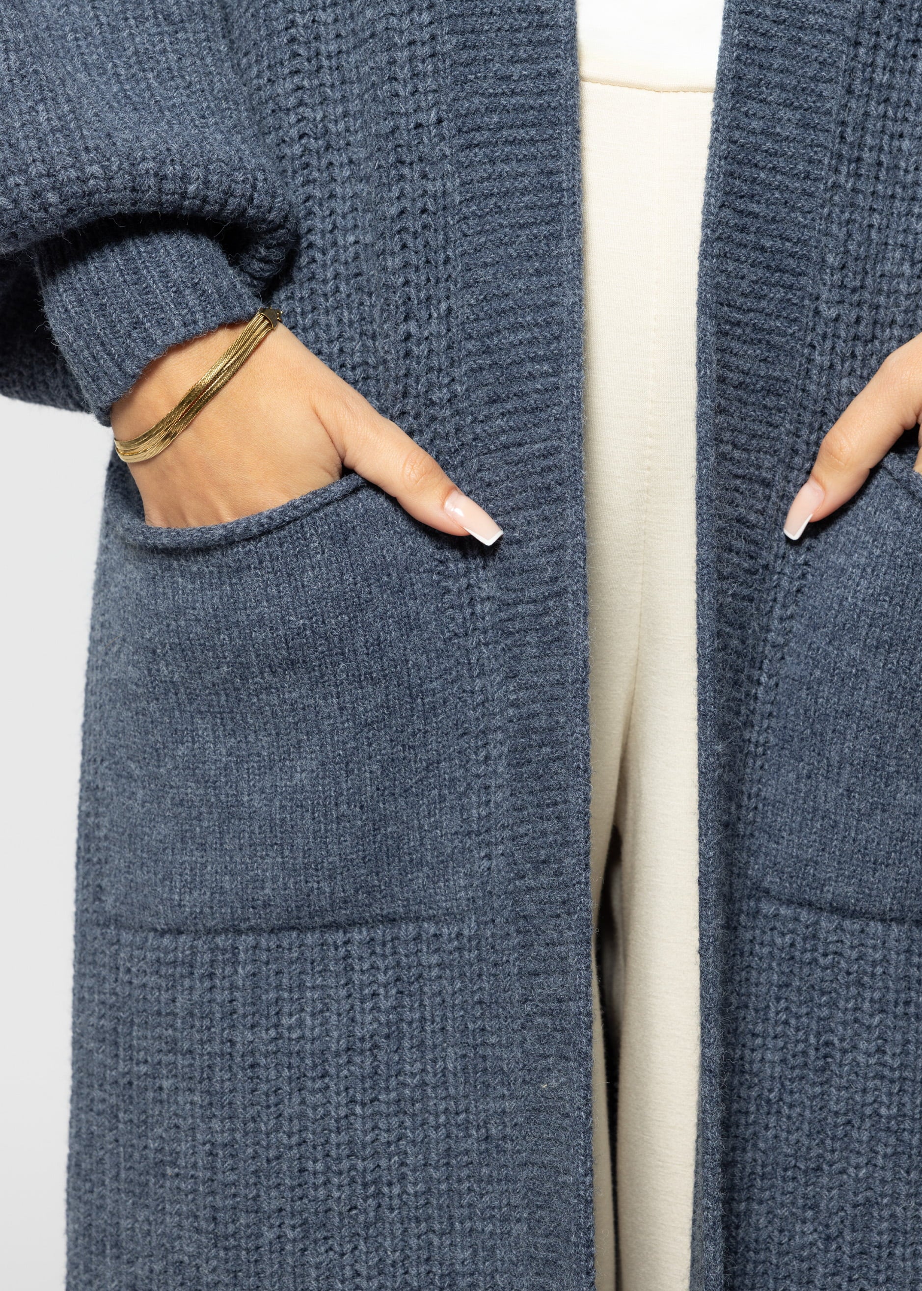 This long cardigan immediately conveys a feeling of sensuality. The style comes in a modern oversized fit, with dropped shoulders and ribbed cuffs and hem. The open silhouette creates a flattering line and allows for effortless layering over different outfits. Patch pockets lend a practical, sporty look. The cardigan is made from super soft knit fabric that will keep you cozy on cooler days and is the perfect it-piece for a cool outfit.