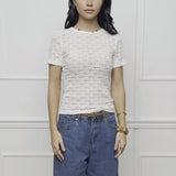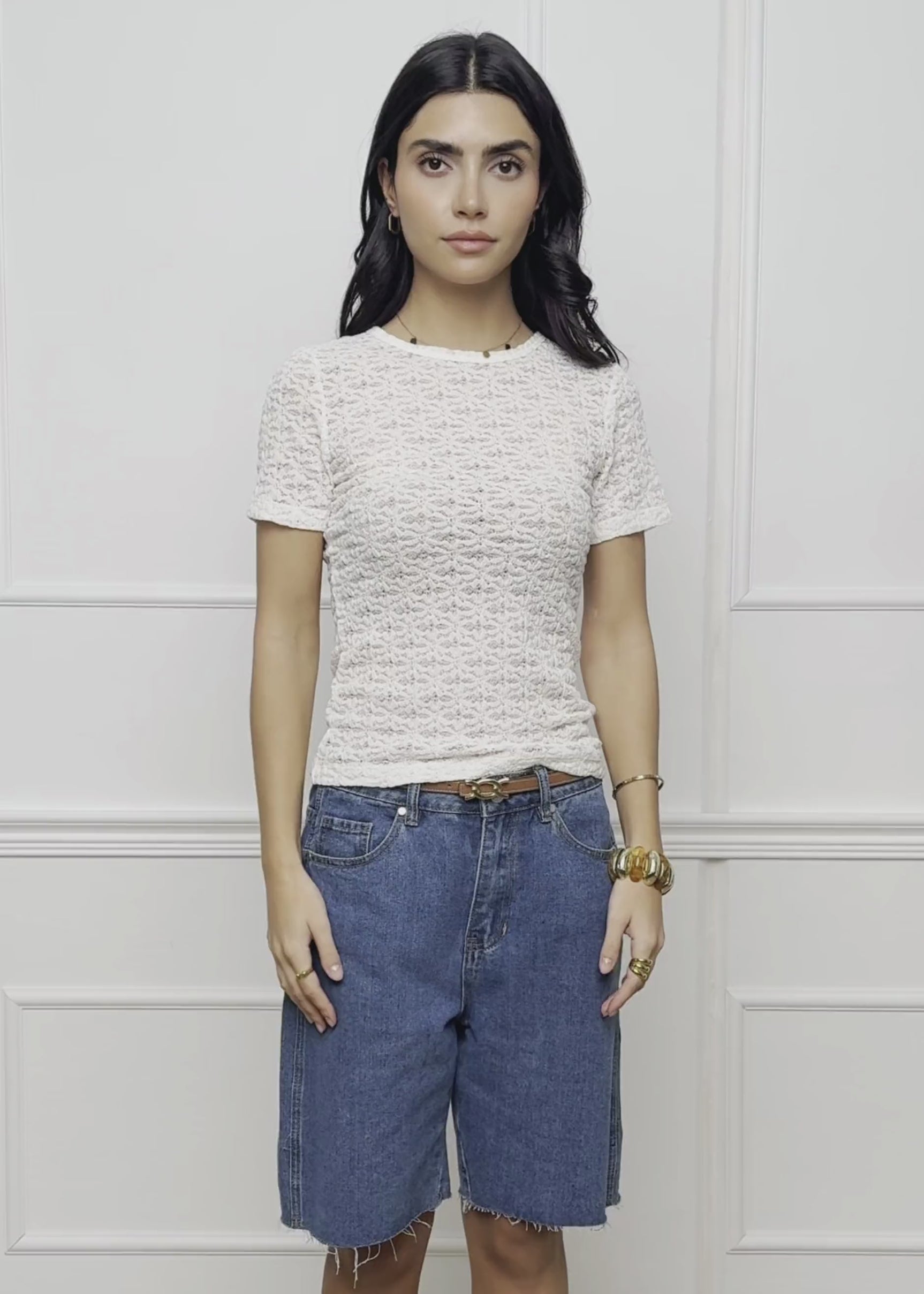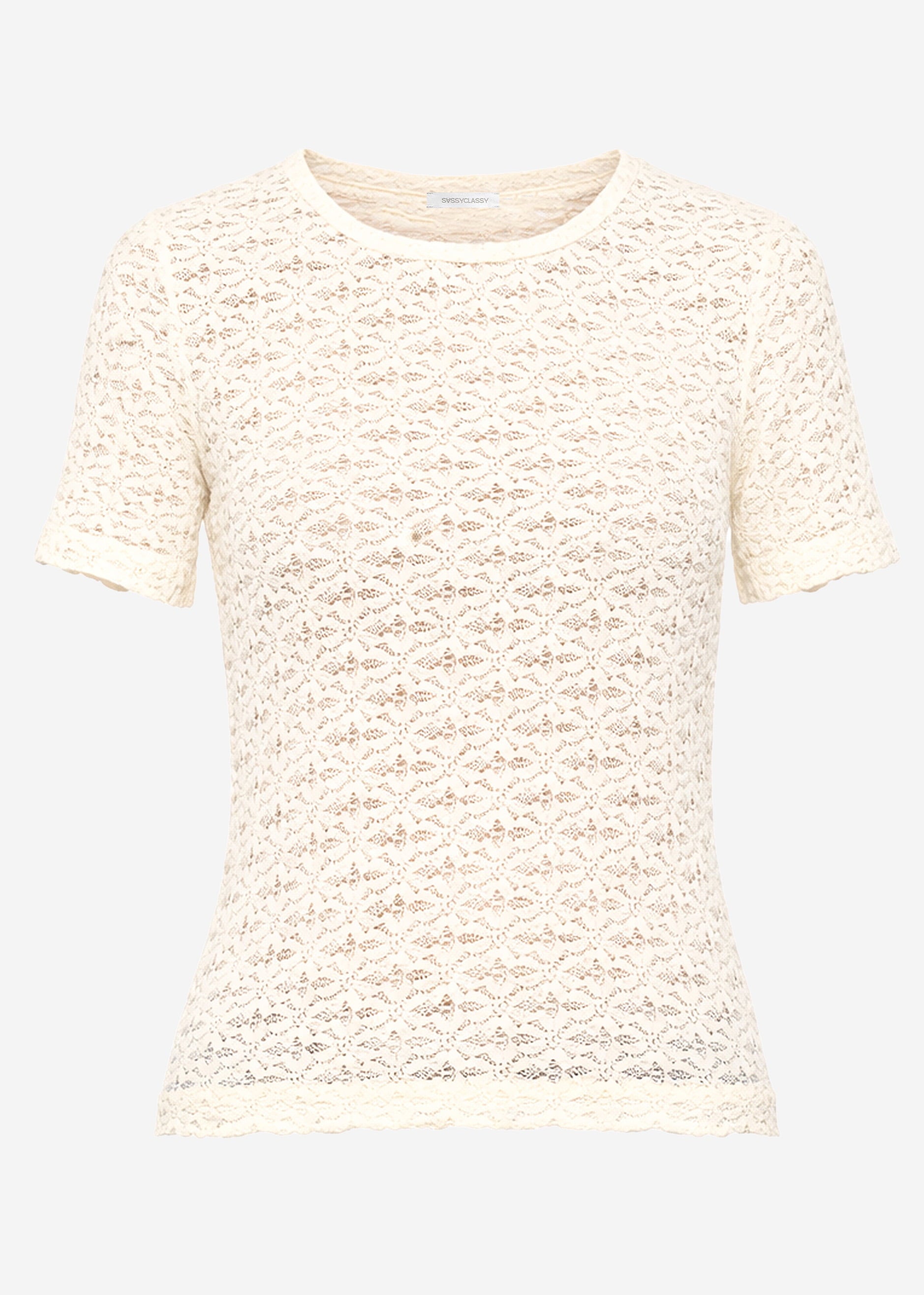 A feminine-cut T-shirt in delicate off-white floral lace. A fine, openwork floral pattern covers the entire garment, featuring a classic round neckline and short sleeves. The slightly sheer fabric creates an elegant, romantic look.