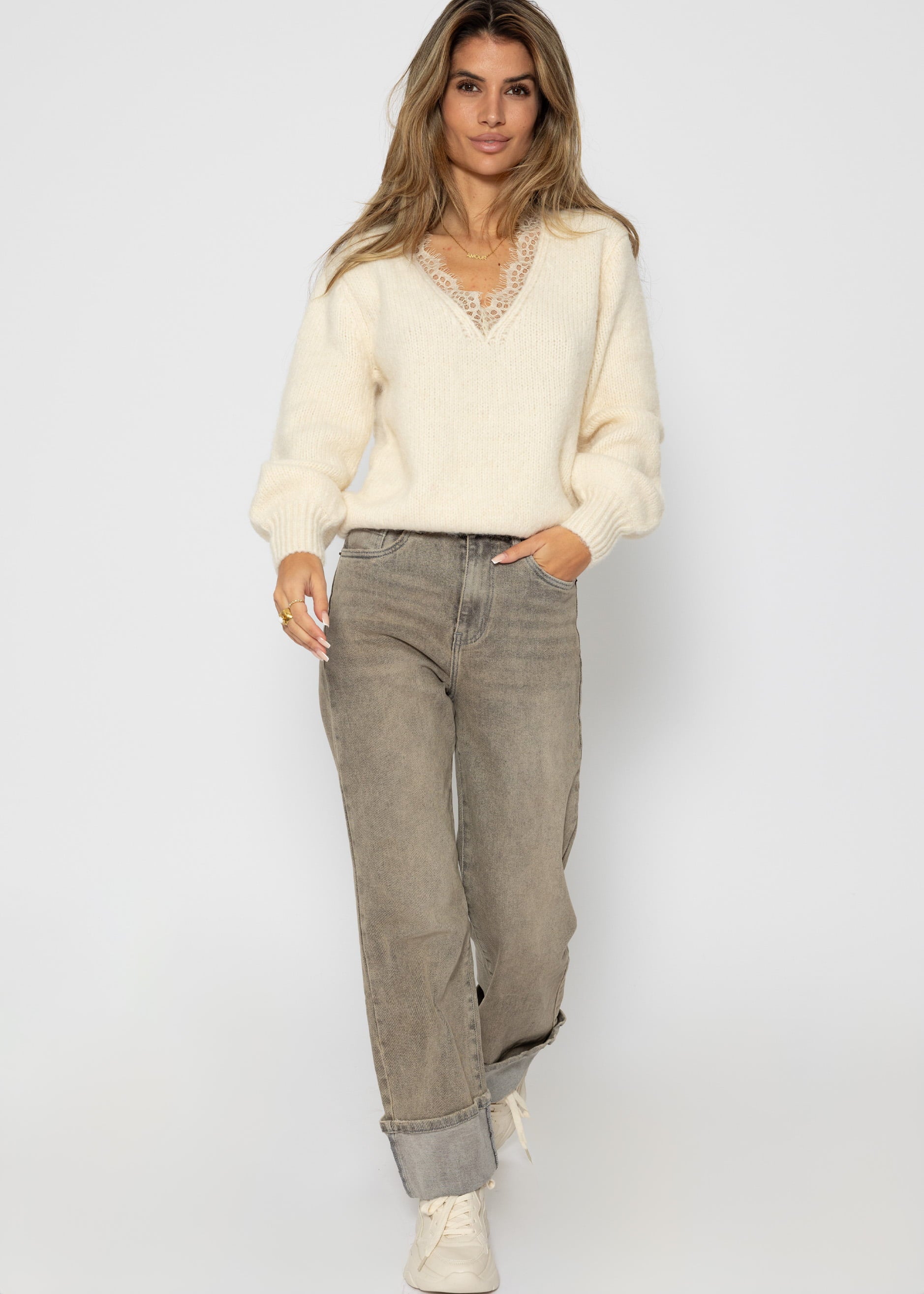 If you are looking for a sweater with timeless beauty, this garment is the perfect choice. This style features long sleeves with ribbed cuffs and a ribbed hem. With its oversized fit and dropped shoulders, the sweater defines a modern silhouette that is both casual and stylish. The classic V-neckline is embellished with lace, giving the sweater a feminine, romantic touch and creating a harmonious connection between the knitwear and the delicate elegance of the lace. Wear it with your favorite jeans and sneakers for a cozy everyday look.