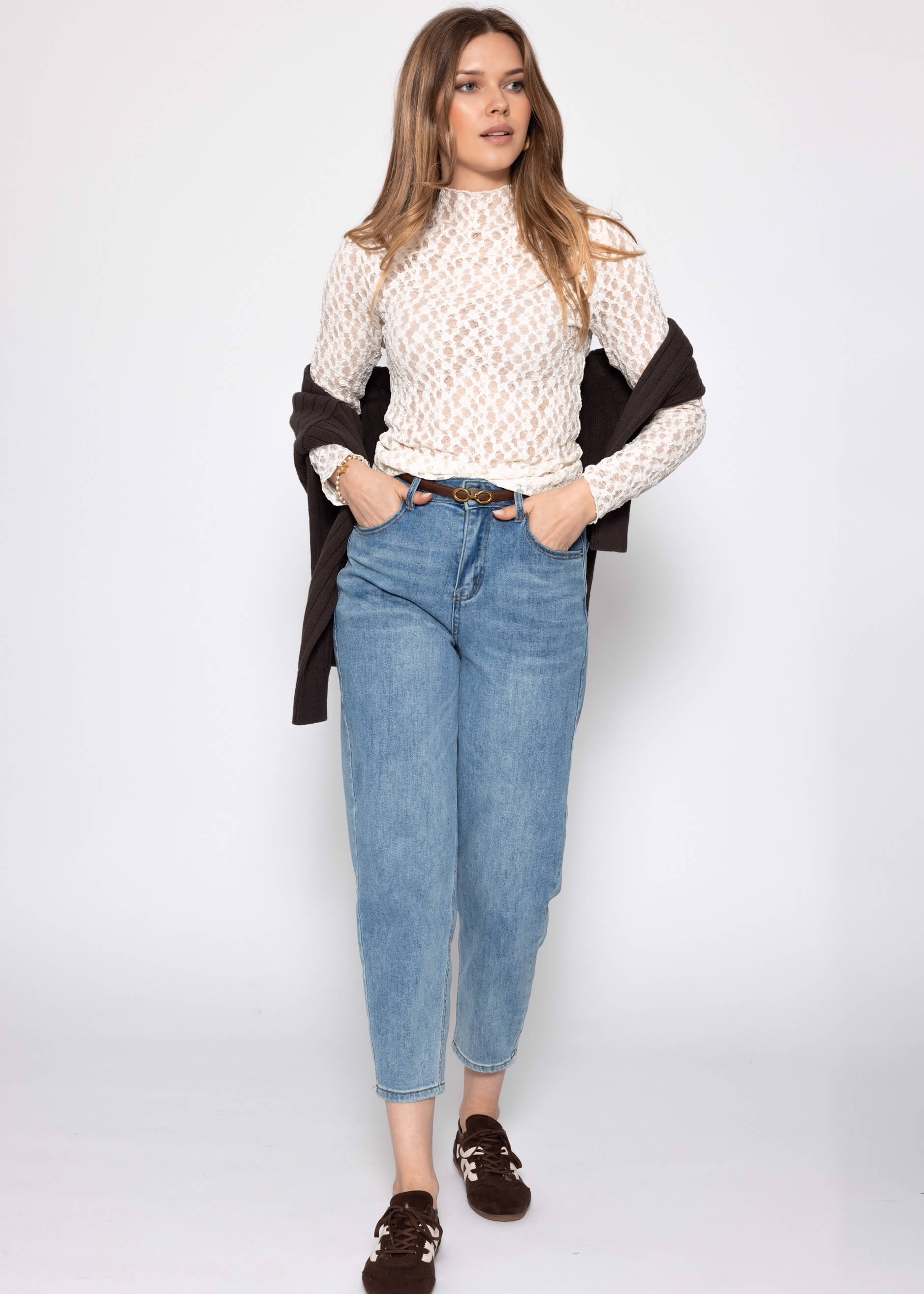 Long-sleeved lace shirt in off-white