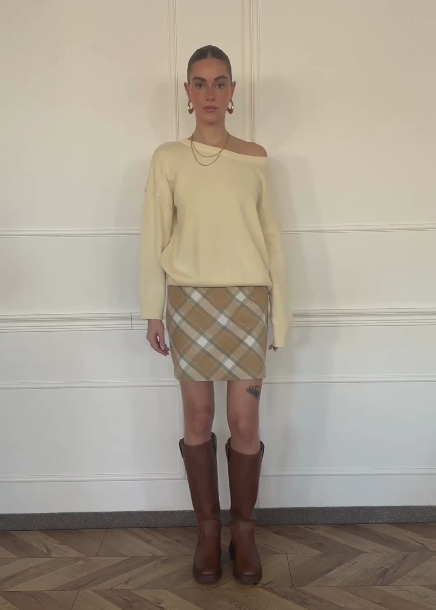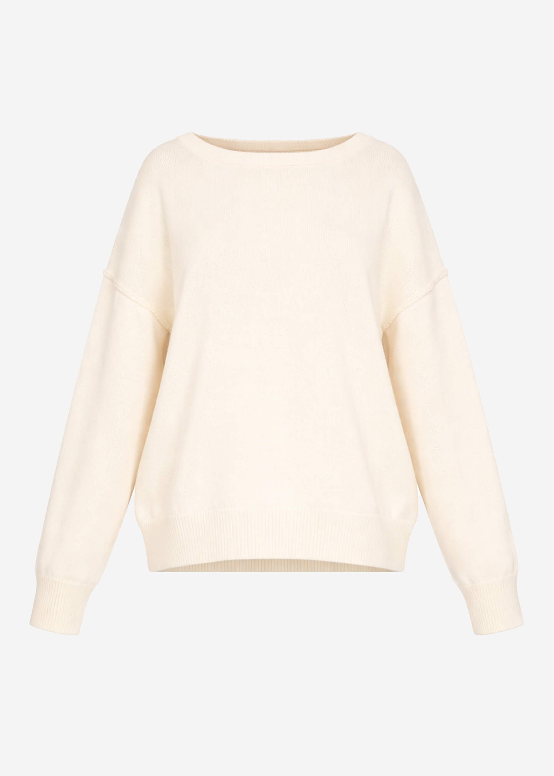 Cotton sweater with decorative outer seams on the sleeves and a visible center back seam. Relaxed, slightly boxy fit with a wide round neckline and wide ribbed cuffs at the hem and sleeves.
