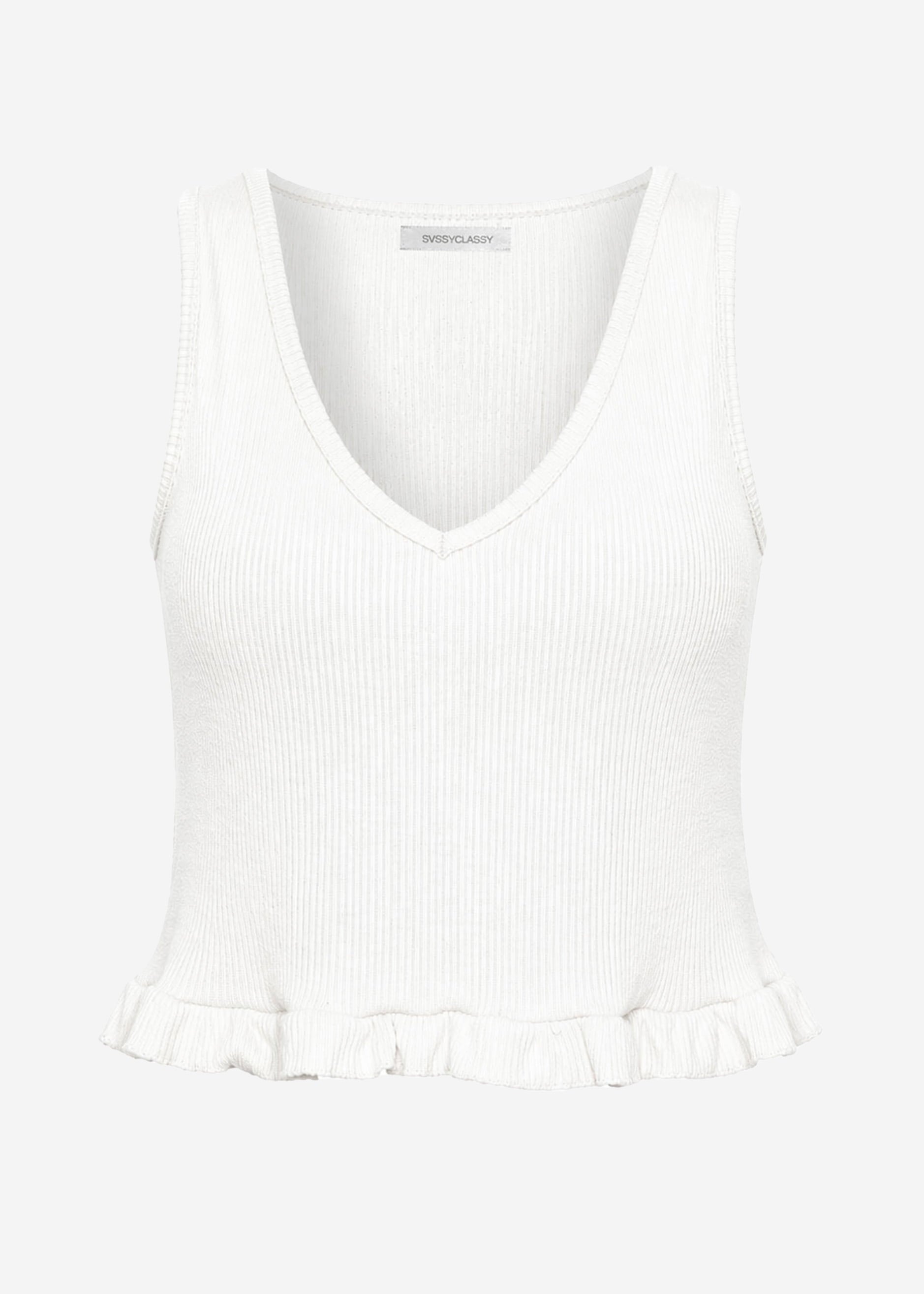 This sleeveless top convinces with its feminine, playful look. The deep V-neckline elegantly emphasizes the cleavage, while the fine rib structure gives the top a modern, slightly structured look. The delicate ruffle finish on the hem looks particularly charming and gives the otherwise simple design a playful note. The top is made of a light, soft material that nestles comfortably on the skin. It is perfect for warm days or as a layering piece among blazers and jackets.