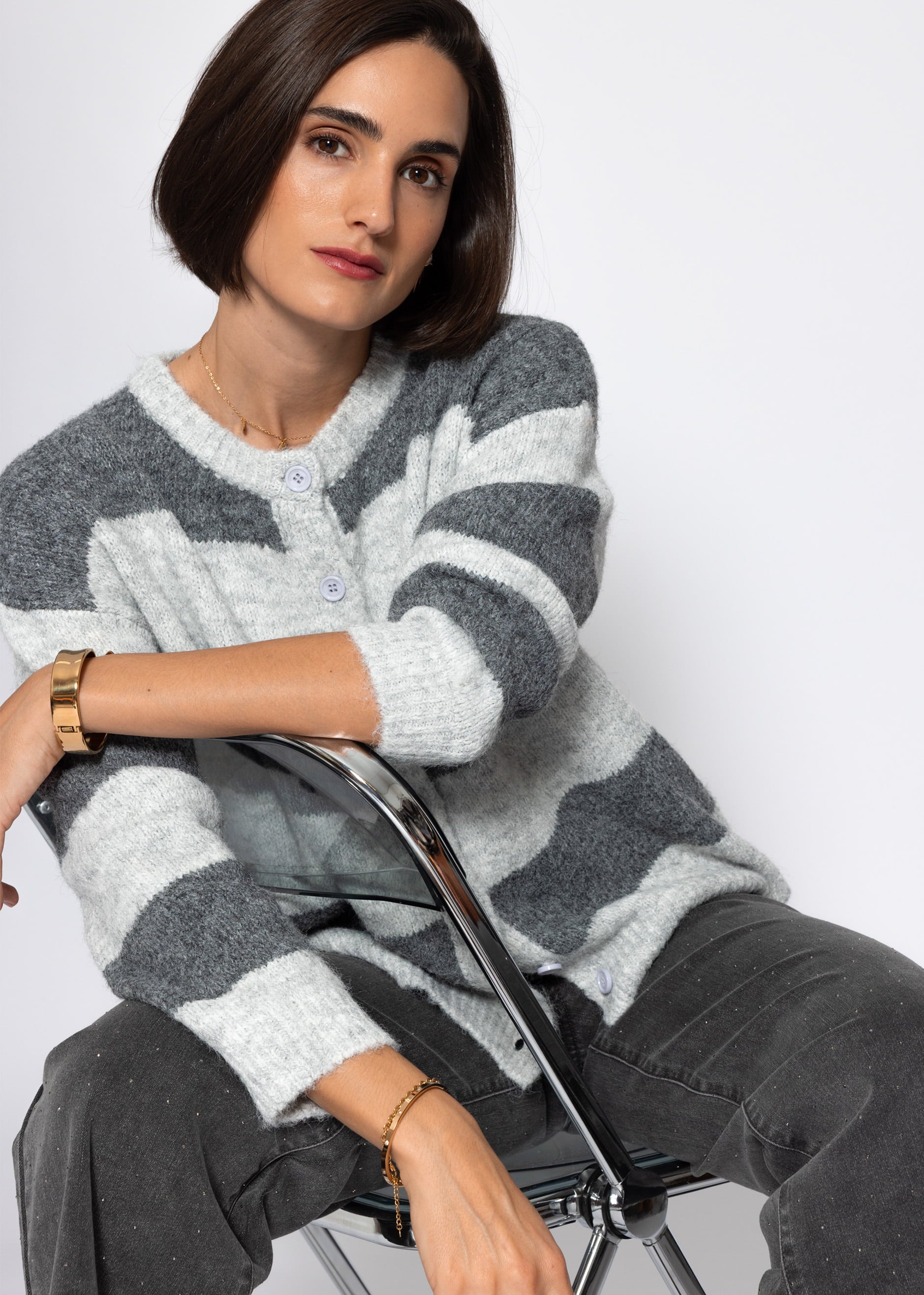This cozy cardigan convinces with wide block strips and a pleasantly soft, fluffy knitting quality. The relaxed fit and the circular neckline give it a casual note, while the continuous button strip offers versatile carrying options-open as a casual layering part or closed for additional warmth. The overcovered shoulders underline the loose cut and ensure high comfort. A versatile essential that can be easily integrated into various outfits!
