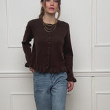 Dark brown cardigan in soft knit with delicate ruffles on the button placket, hem, and sleeves. The loose fit creates a feminine and elegant look.