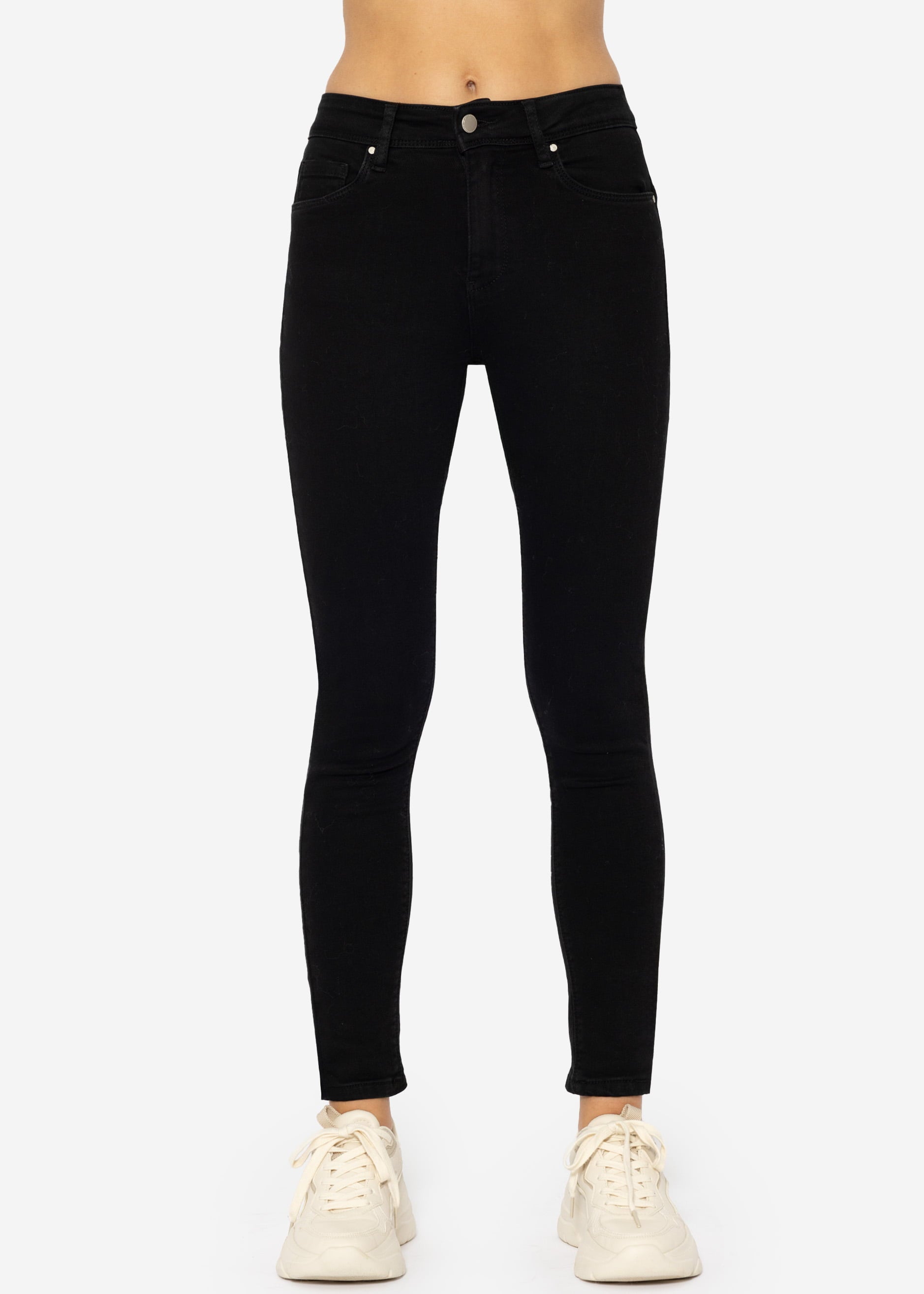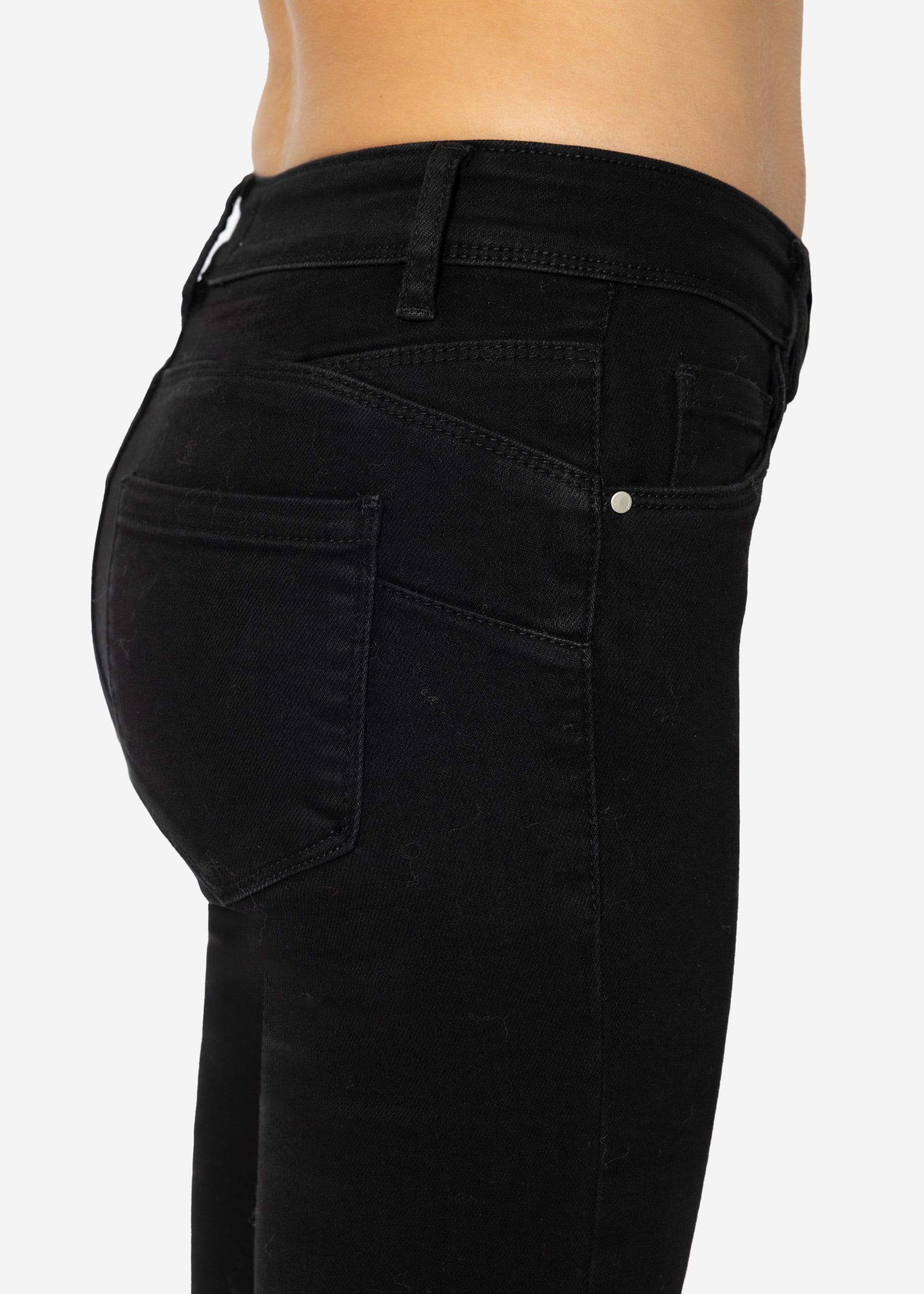 High-waisted push-up jeans in black. This model features a button and zip closure, a tight fit, a high waist, and a 5-pocket design. Made from a soft, stretchy cotton blend, it's super comfortable and fits perfectly. The skinny fit expertly highlights your legs and visually lengthens them. The diagonal seams create a push-up effect. For a trendy look and the perfect contrast, we recommend pairing these jeans with oversized pieces. You can style them with a loose, cool T-shirt and a loose-fitting blazer, or simply with our muslin blouse. Chunky loafers or platform sneakers complete this trendy outfit.
