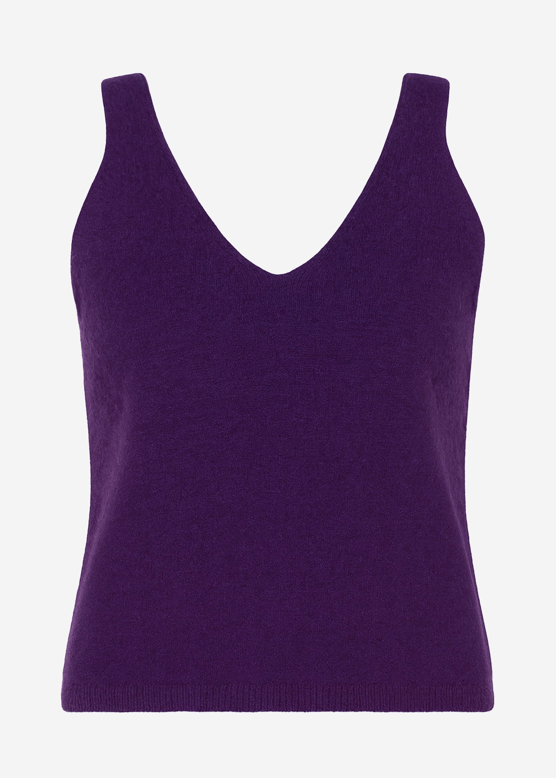 This knit top features a V-neck, cropped length, and wide straps. Made from a soft wool blend with cashmere, it feels comfortable against the skin. This top proves to be an elegant essential under cardigans, blazers, and jackets.