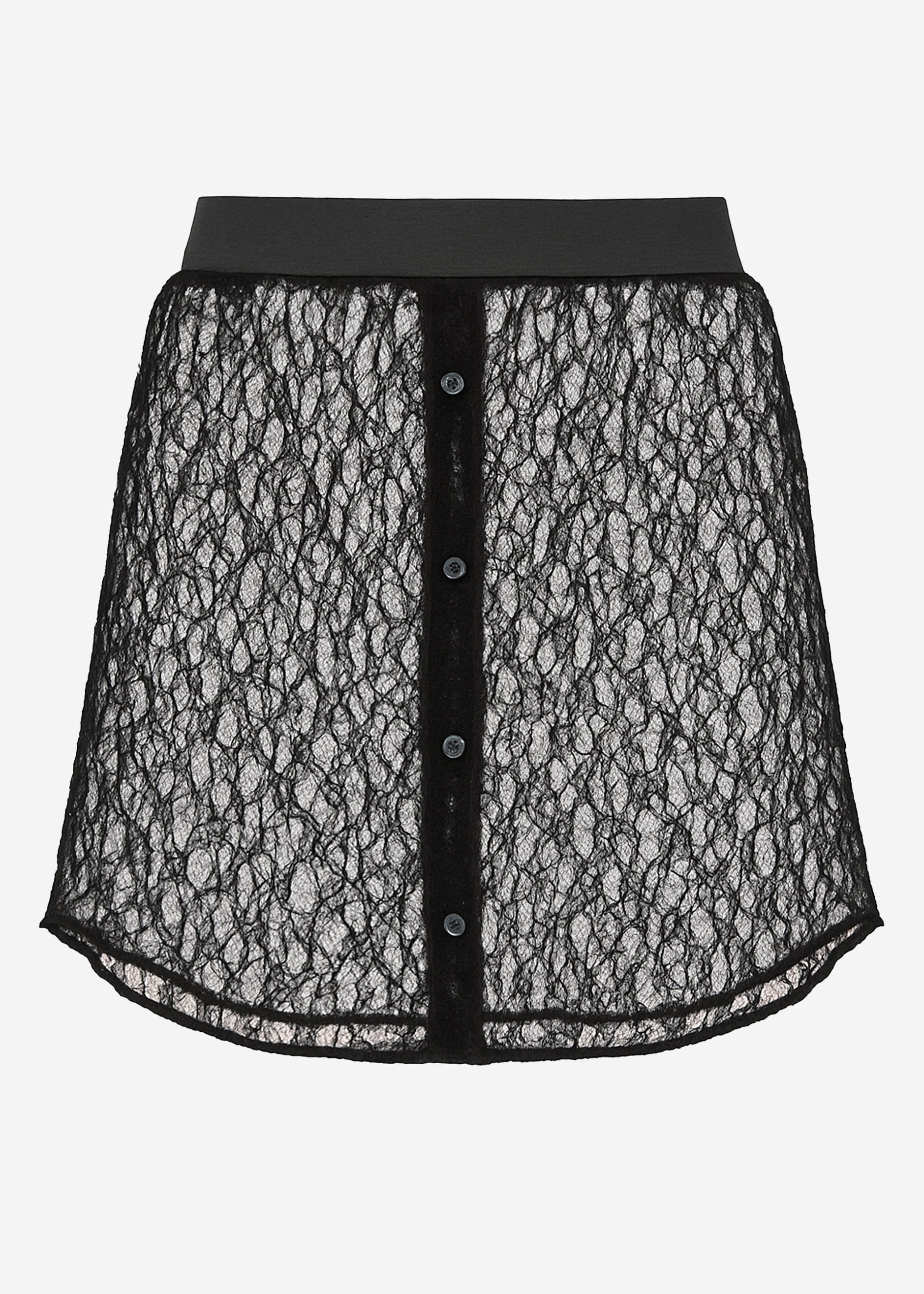 This blouse skirt made of elegant black lace has an elastic waistband and a button placket. It is slightly longer at the back than at the front.