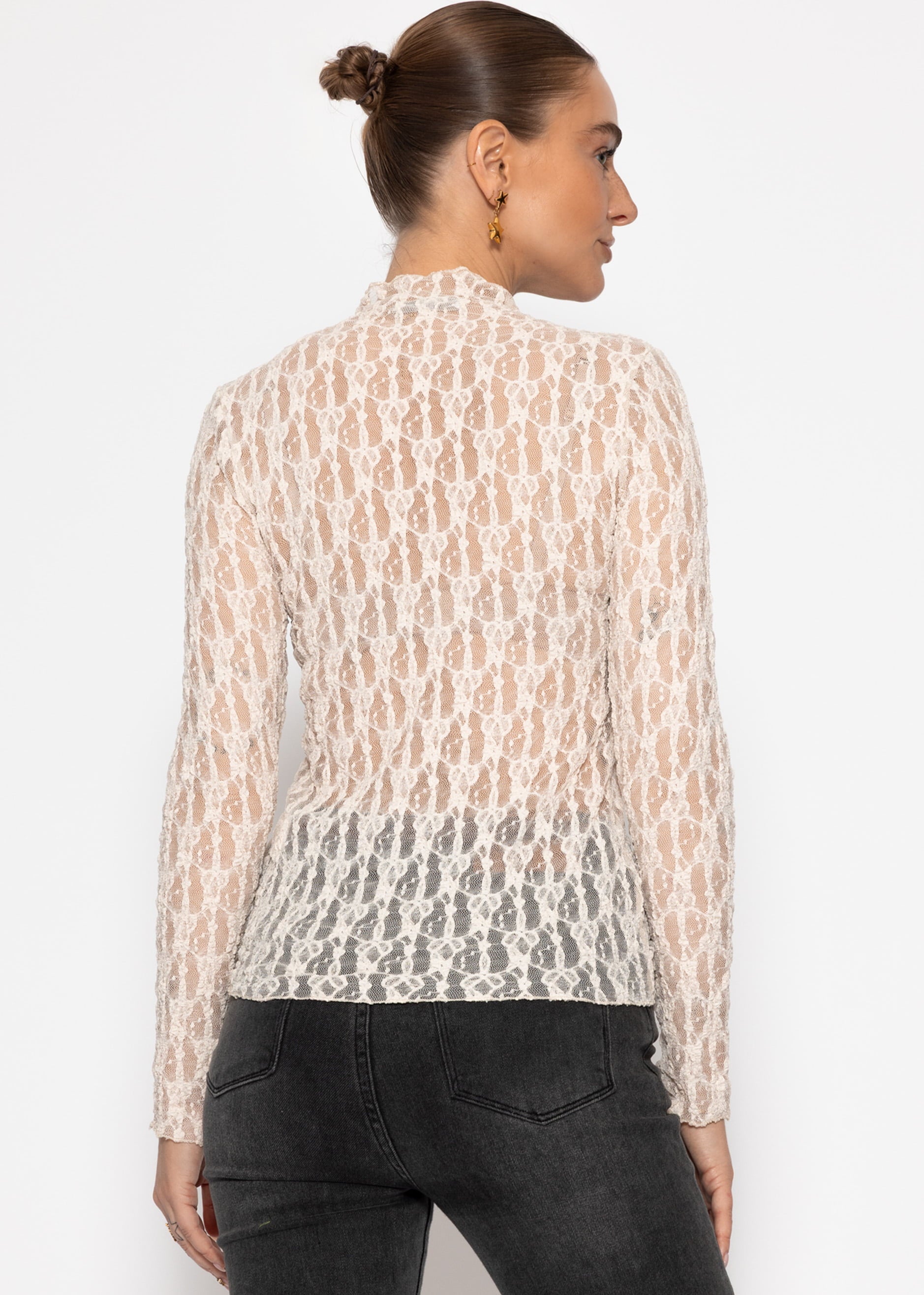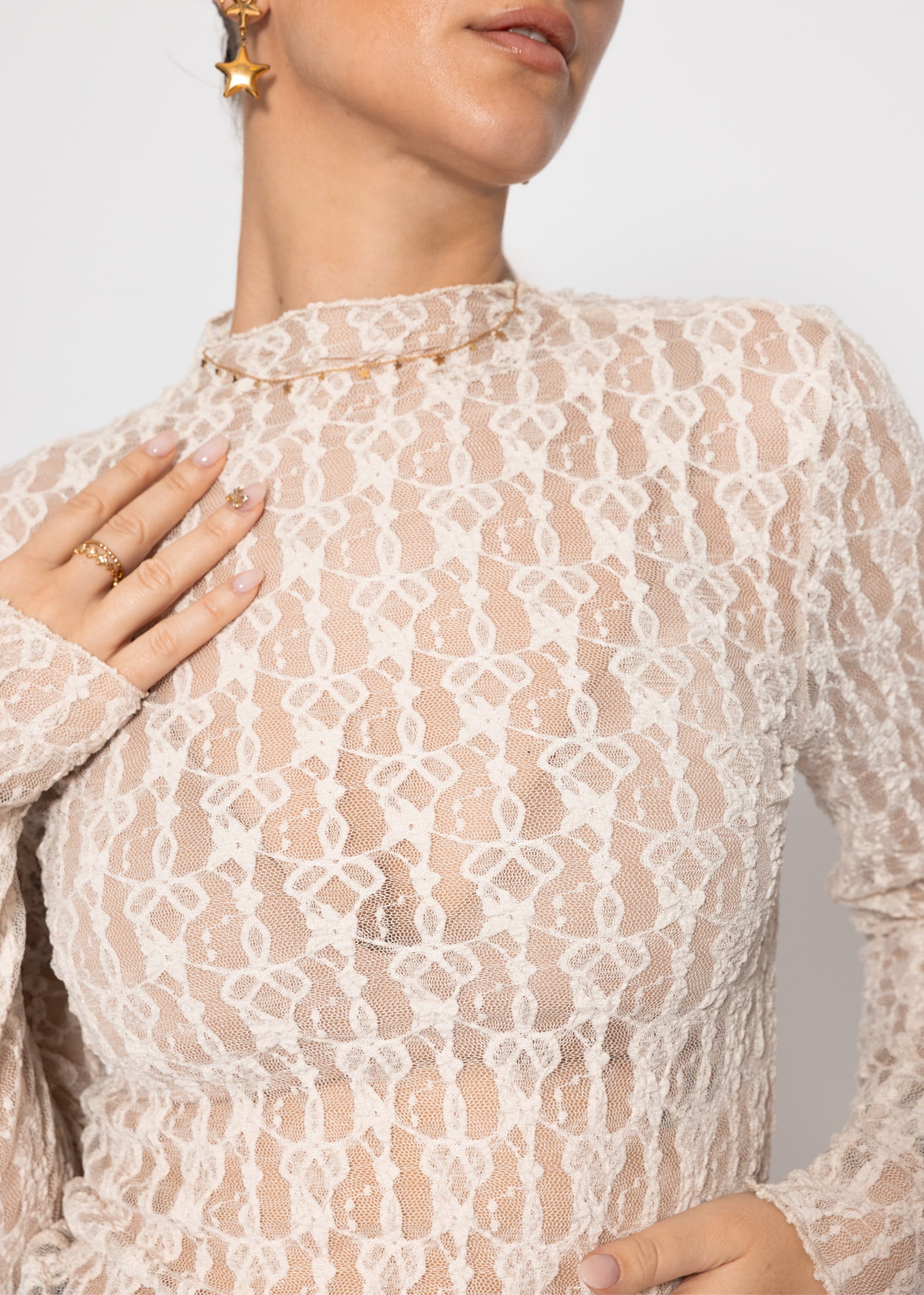 Long-sleeved top made of sheer lace with a floral pattern. Figure-hugging cut with a round neckline. Feminine look thanks to delicate lace and subtle transparency.
