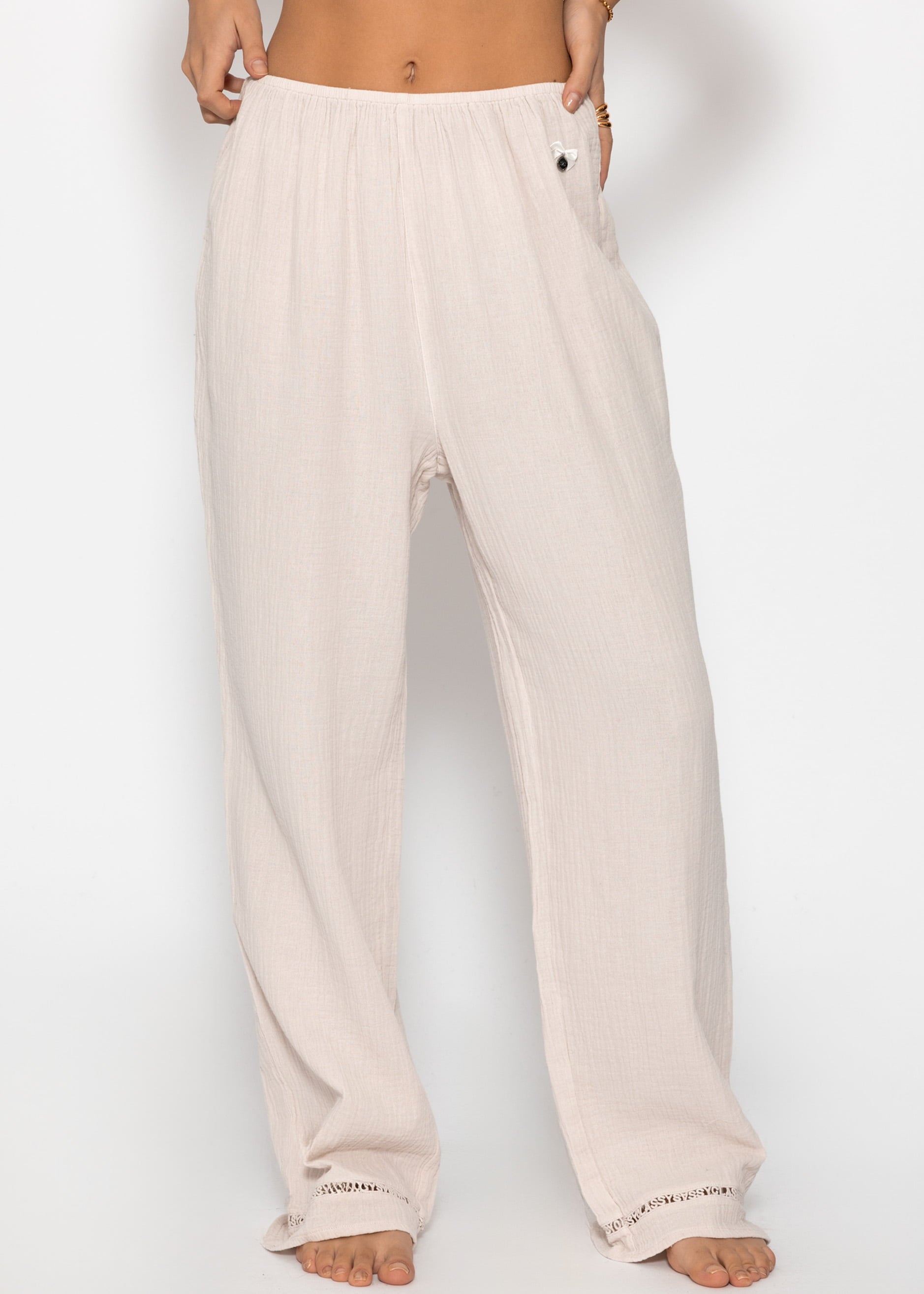 These long pyjama trousers feature a loose fit, wide legs and an elasticated waistband. Made from high-quality cotton muslin, these pyjama trousers offer excellent breathability. The SASSYCLASSY logo bow on the waistband adds a playful accent and gives the pyjama bottoms a distinctive touch. The highlight is the lace trim at the leg ends, which adds a fashionable, feminine touch. Combined with the matching short or long pyjama shirt from the same range, these pyjamas are a symbiosis of style and comfort.