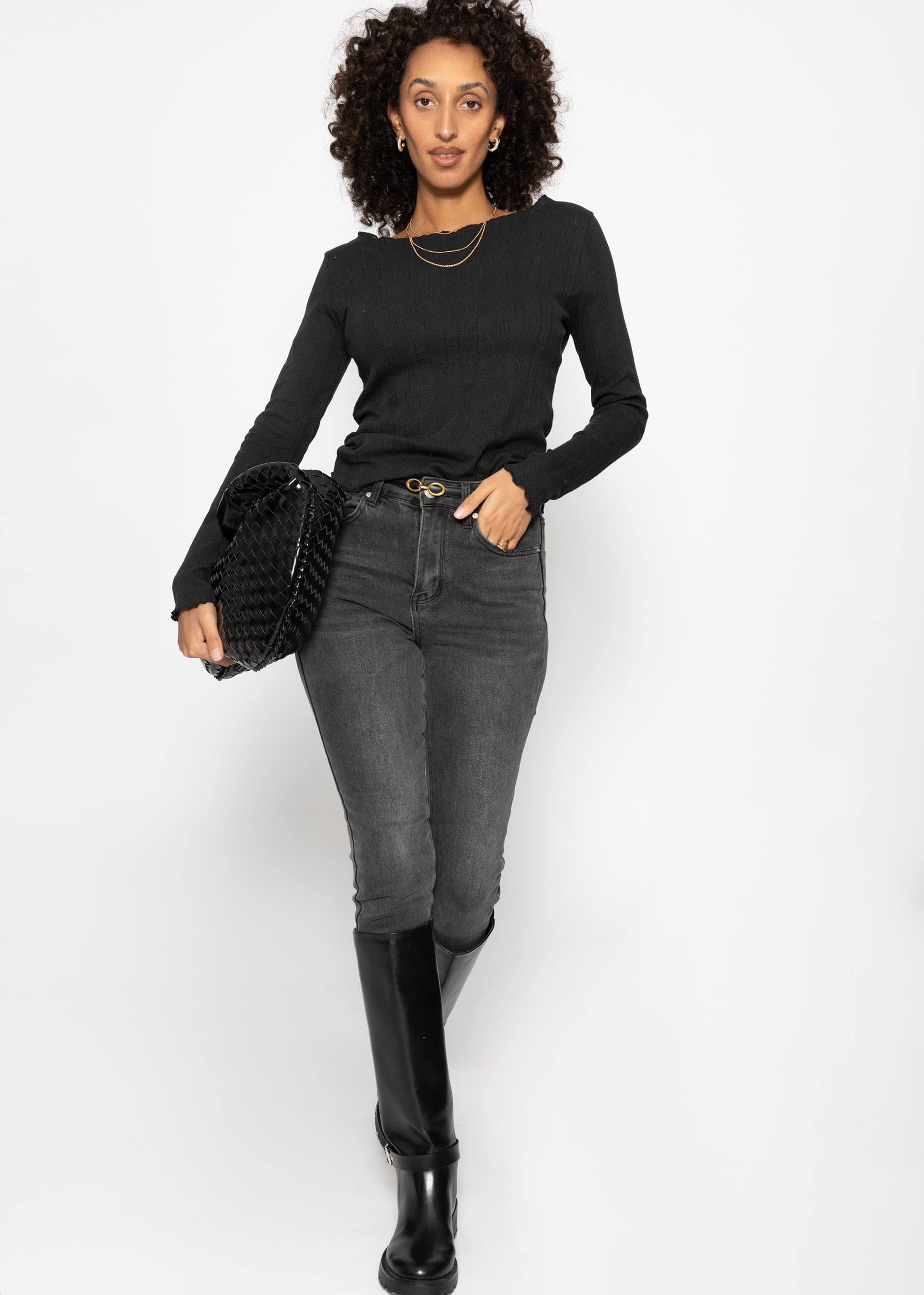 Black pointelle long-sleeved top with a feminine openwork pattern and elegant boat neckline. The figure-hugging cut features long sleeves and a slightly wavy hem for a subtle, playful touch. A versatile basic, ideal for both elegant and casual looks.