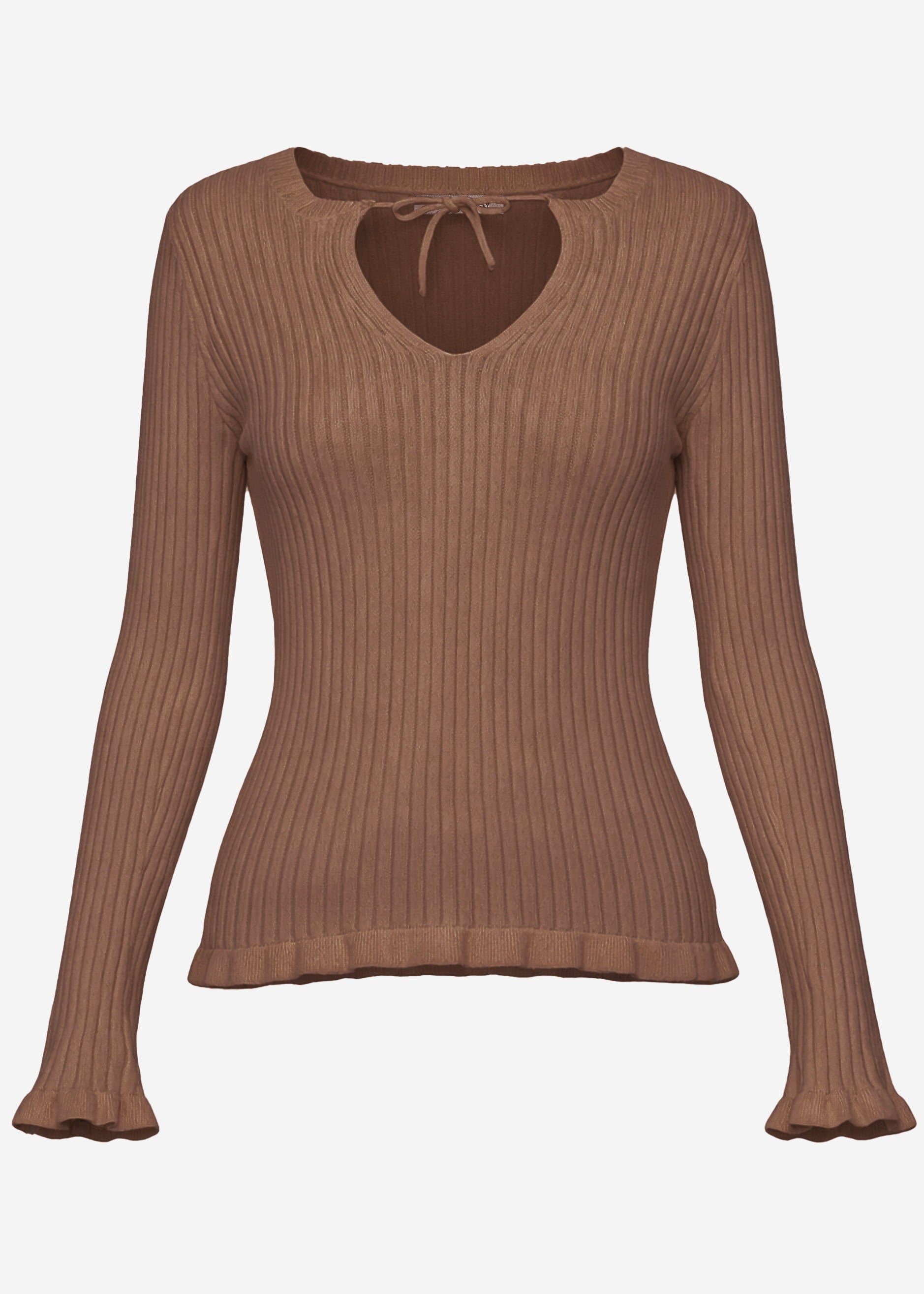 Brown ribbed knit long-sleeved shirt with a fine texture and feminine cutout at the neckline with tie fastening. Figure-hugging cut with slightly flared sleeves and a wavy hem for a playful touch. A stylish essential that adds a modern and elegant touch to simple looks.