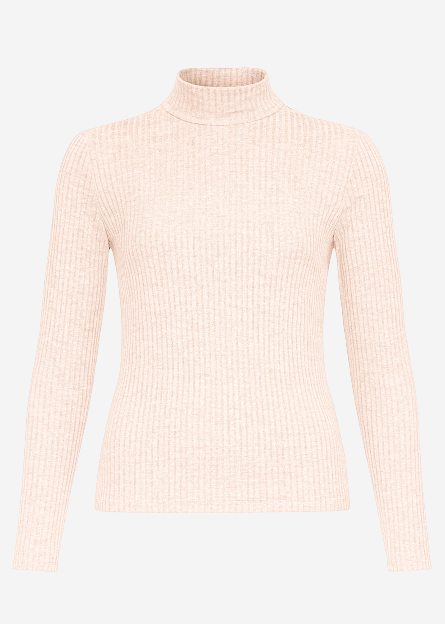 Ribbed long-sleeved shirt in beige with a narrow stand-up collar for a clean, feminine look. The figure-hugging fit and soft fine knit make it a versatile basic for layering and everyday outfits.
