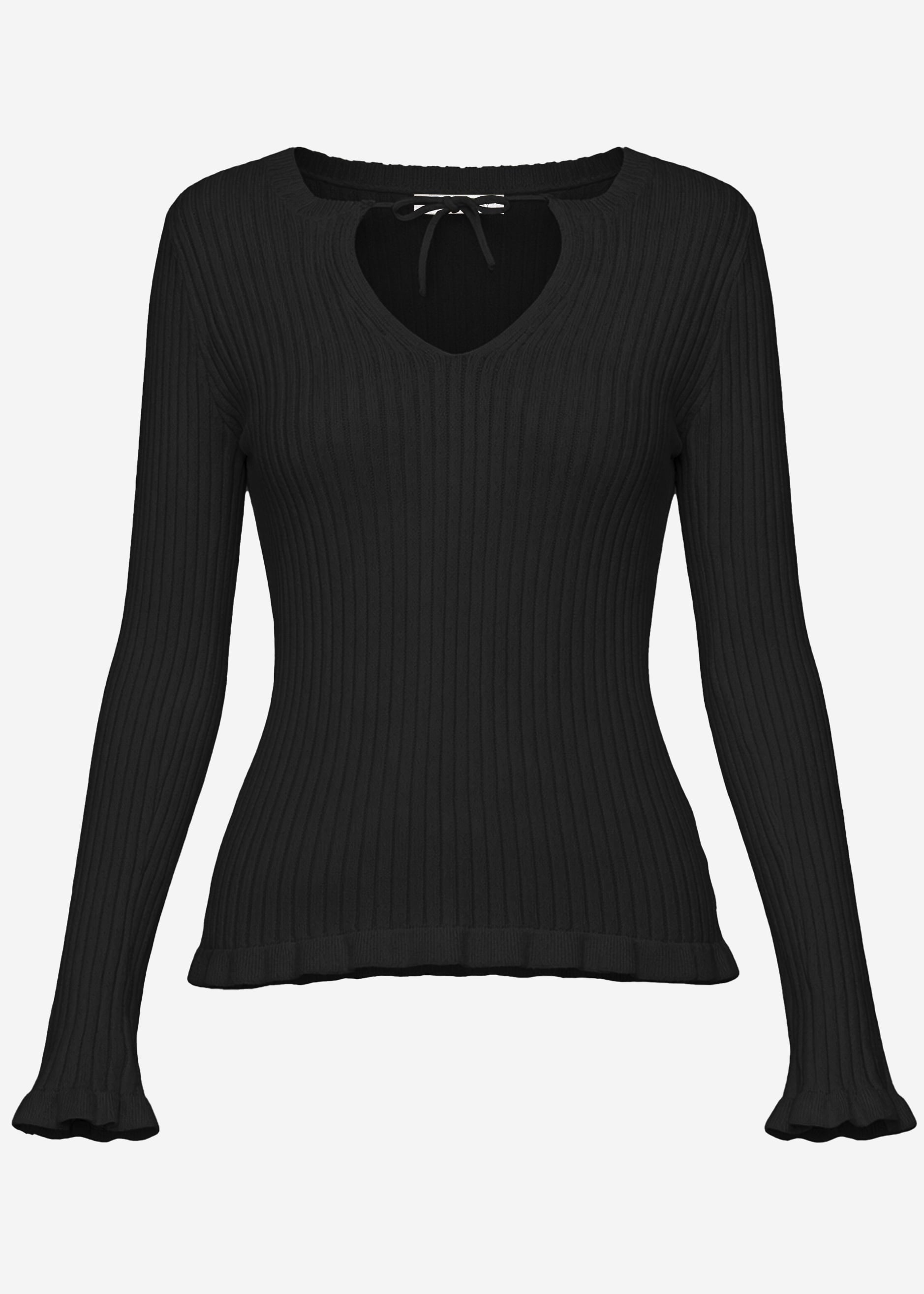 Schwarzes Rippstrick-Langarmshirt mit feiner Struktur und femininem Cut-out am Ausschnitt mit Bindeband. Figurbetonter Schnitt mit leicht ausgestelltem Ärmelabschluss und gewelltem Saum für eine verspielte Note. Ein stilvolles Essential, das schlichte Looks modern und elegant ergänzt.