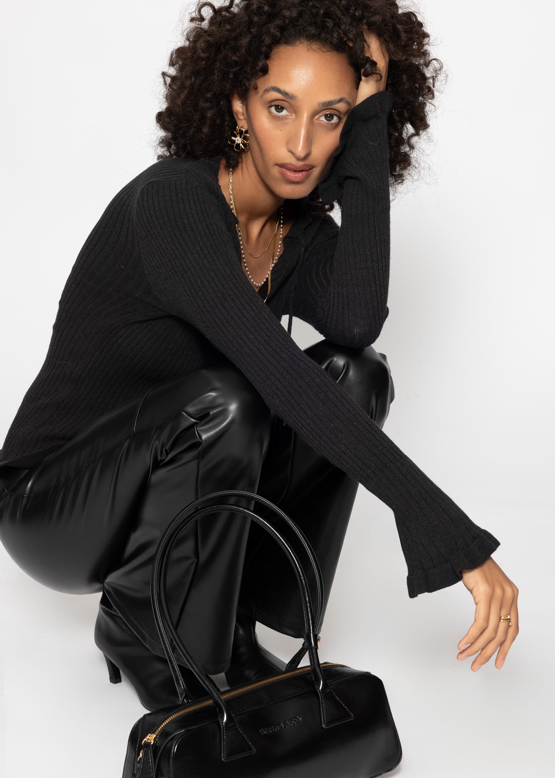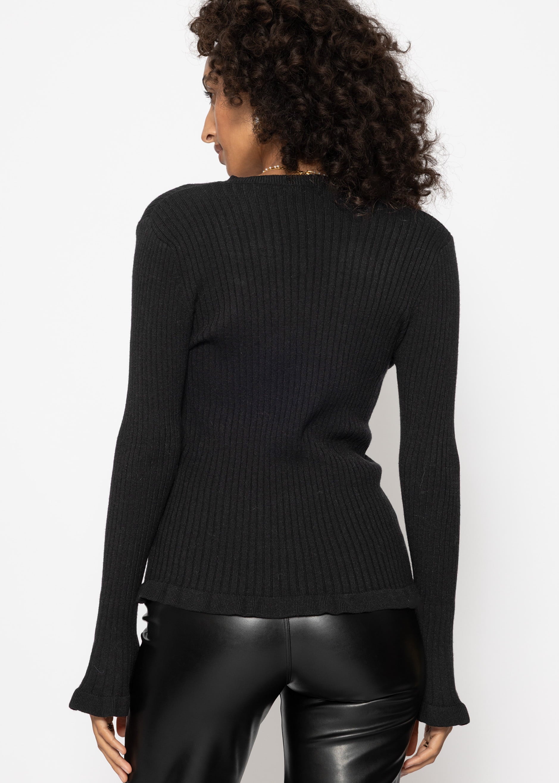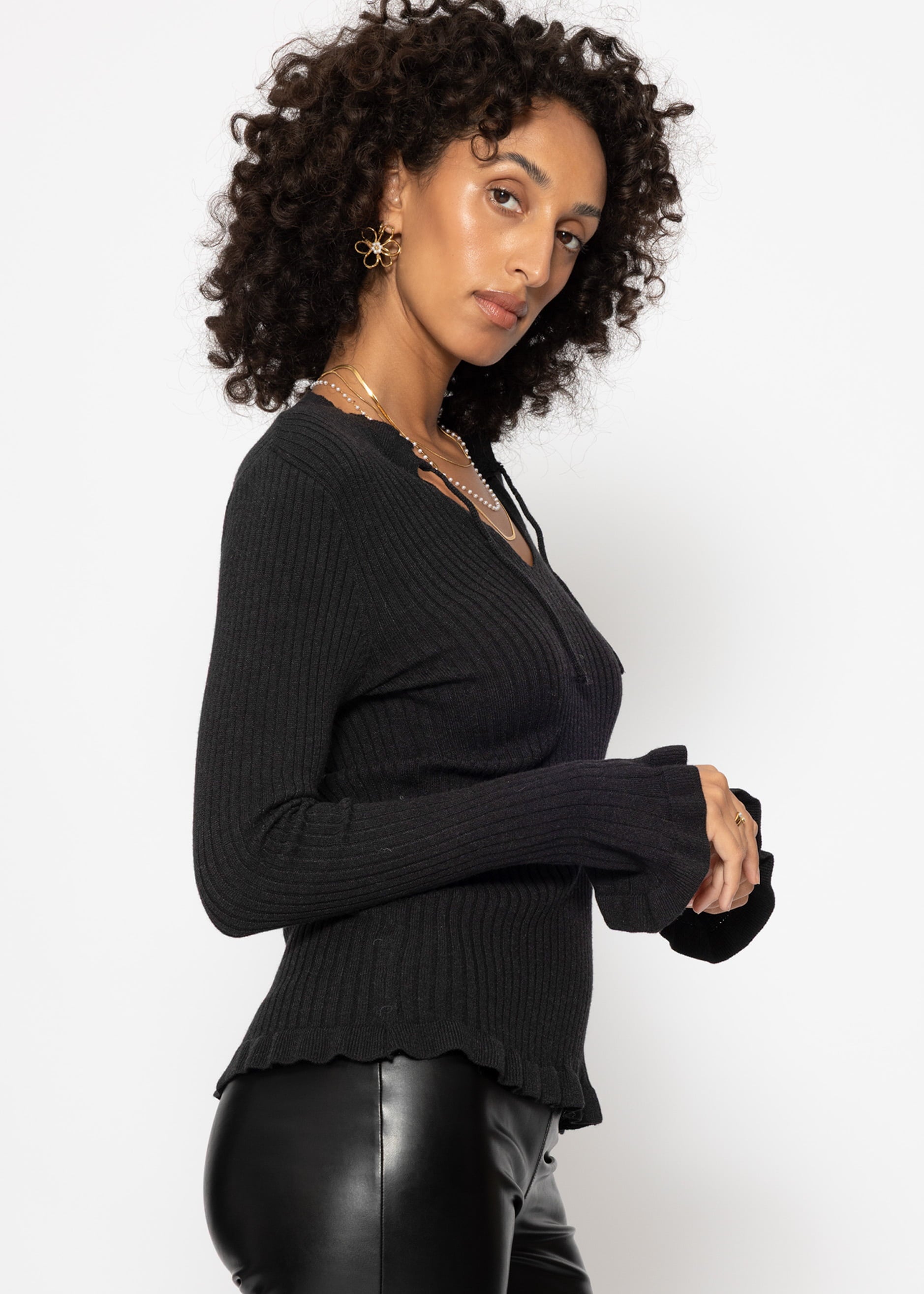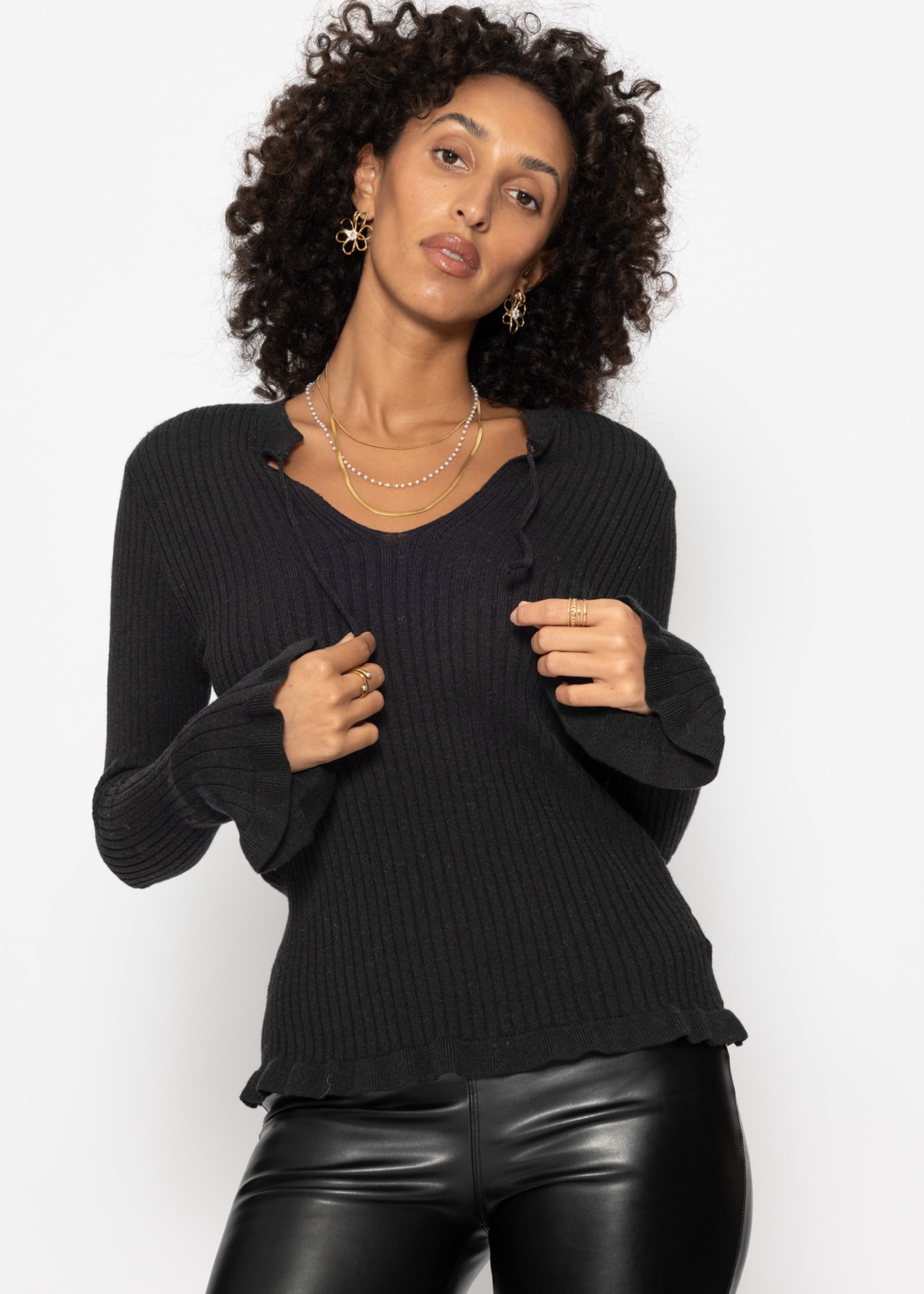 Rippstrickoberteil mit Bindeband am Ausschnitt - schwarz