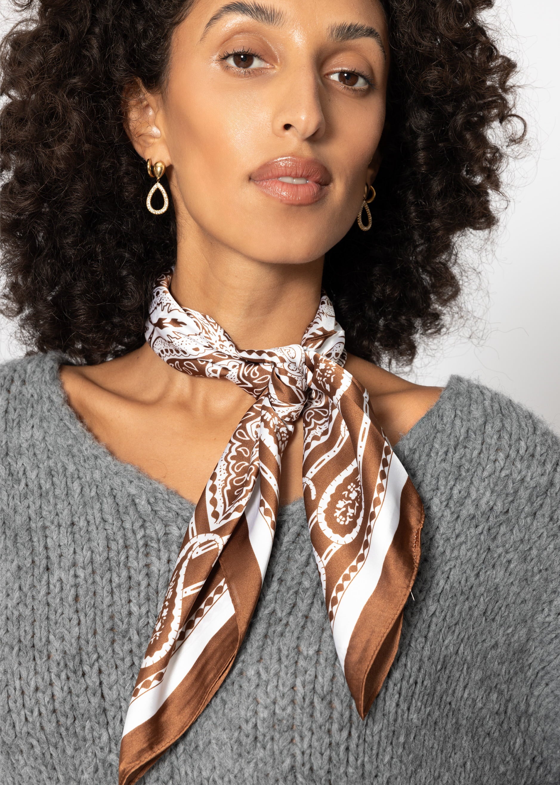 This trendy scarf adds elegance to your wardrobe. The beautiful paisley print gives every outfit a trendy touch, while the light, flowing material ensures a comfortable fit. Whether casually draped around your neck, worn as a fashionable hairband, or attached decoratively to your handbag, this scarf is the perfect accessory for any occasion.