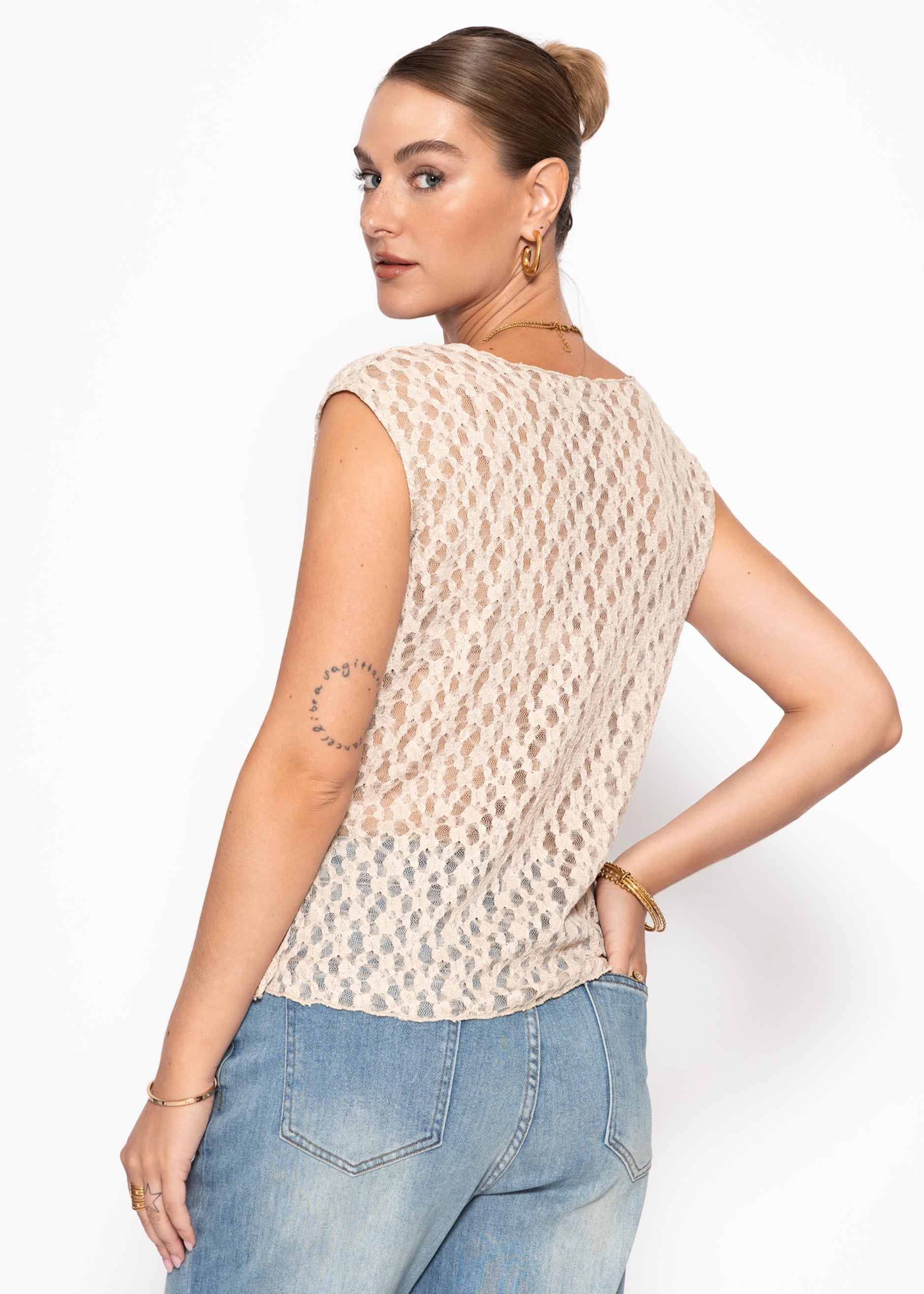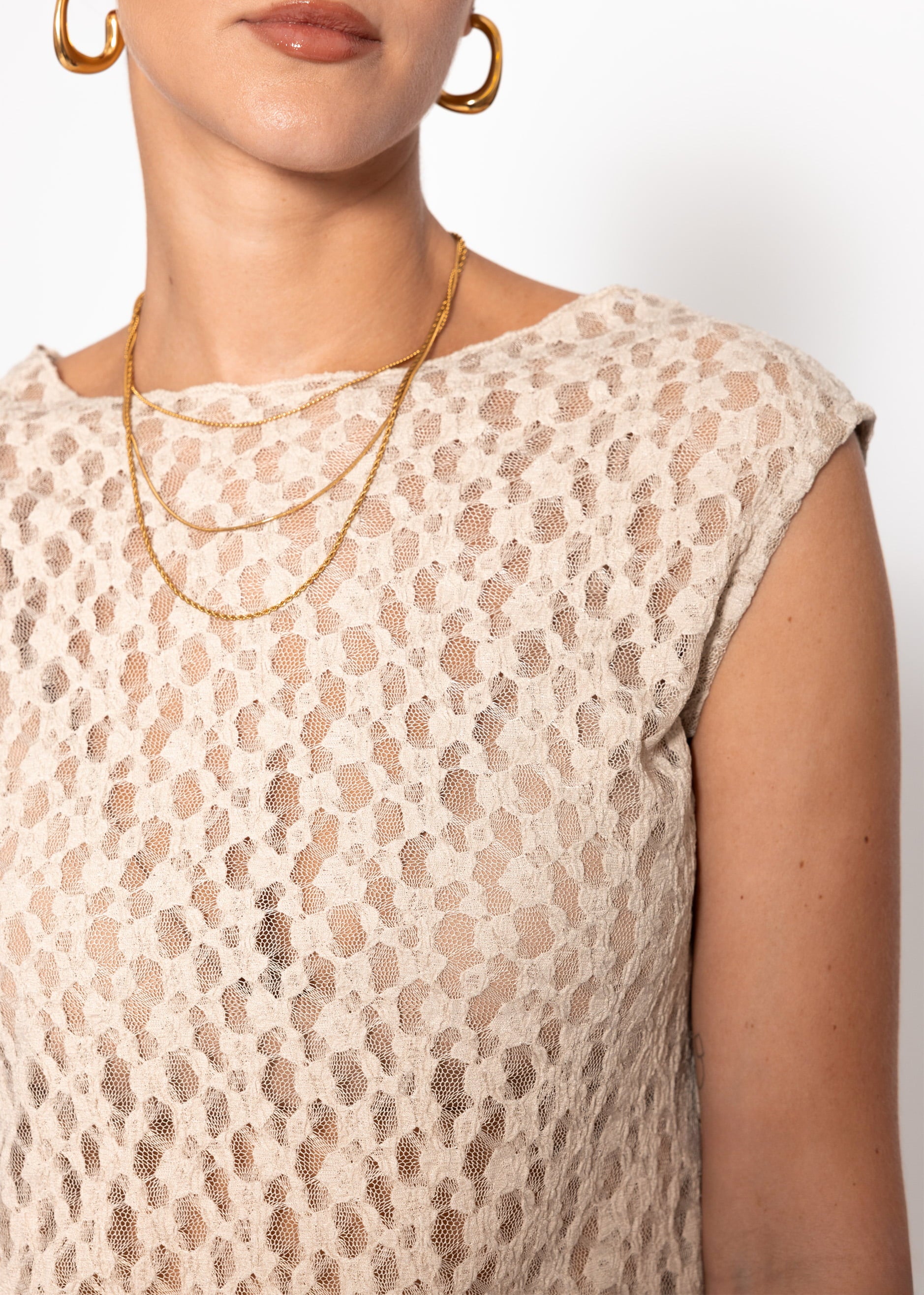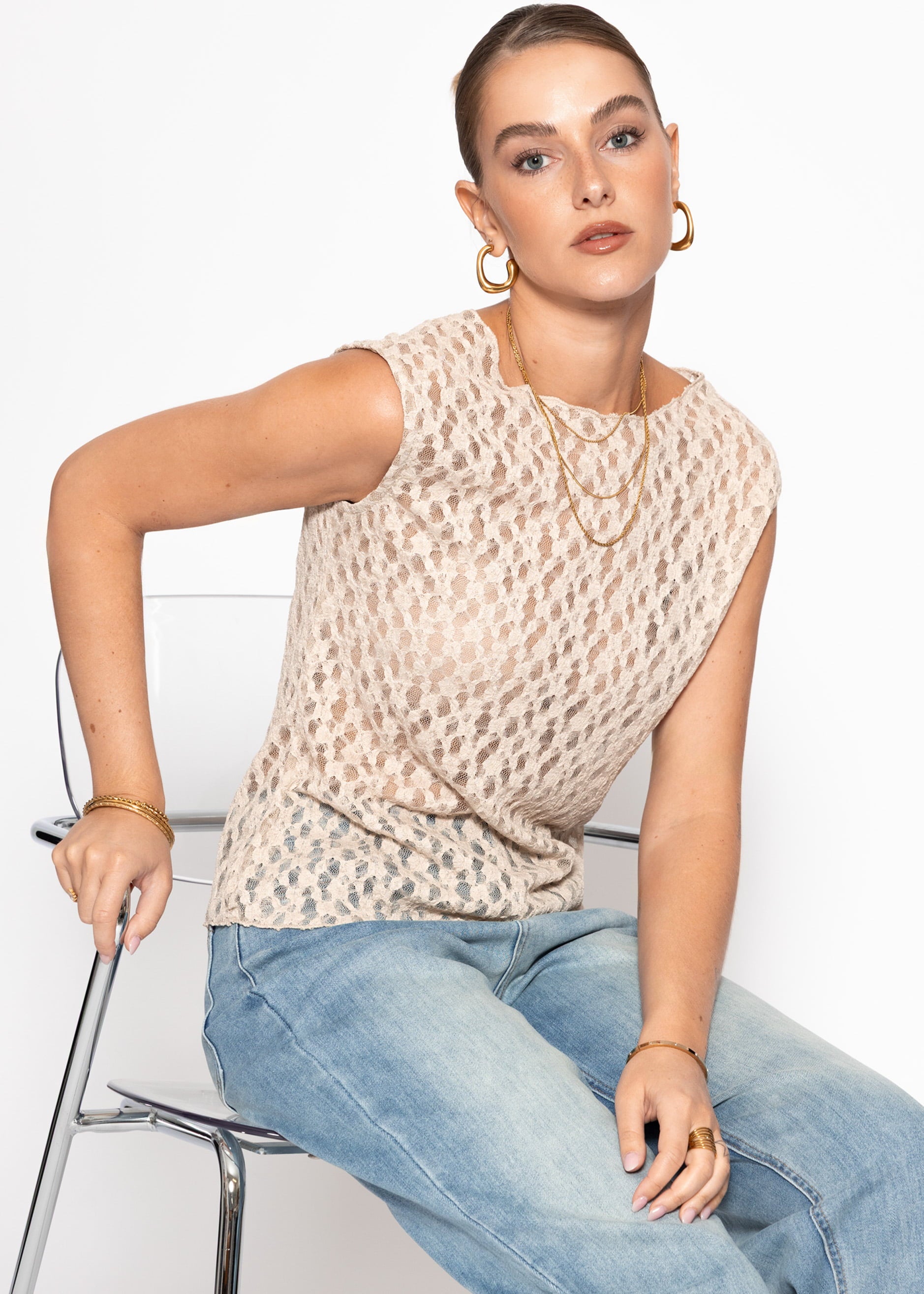 Ärmelloses Top mit leicht transparenter, strukturierter Spitze in Beige. Femininer Look mit leichtem Stretch und modernem, figurnahen Sitz. Perfekt für elegante Layering-Outfits.