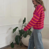 This striped cardigan in orange and pink features a modern striped pattern and a relaxed silhouette. It has a full-length button placket, a round neckline, and ribbed trim at the hem and sleeves.