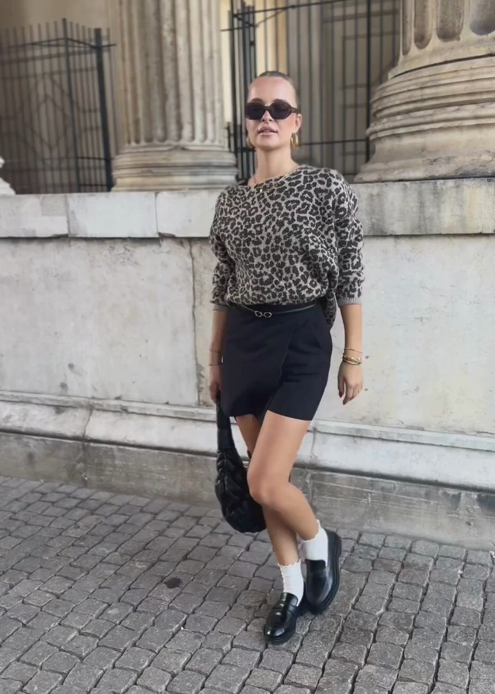 Dieser Pullover mit markantem Leo-Muster bietet gemütlichen Tragekomfort. Der weite U-Boot-Ausschnitt kann lässig über eine Schulter getragen werden.