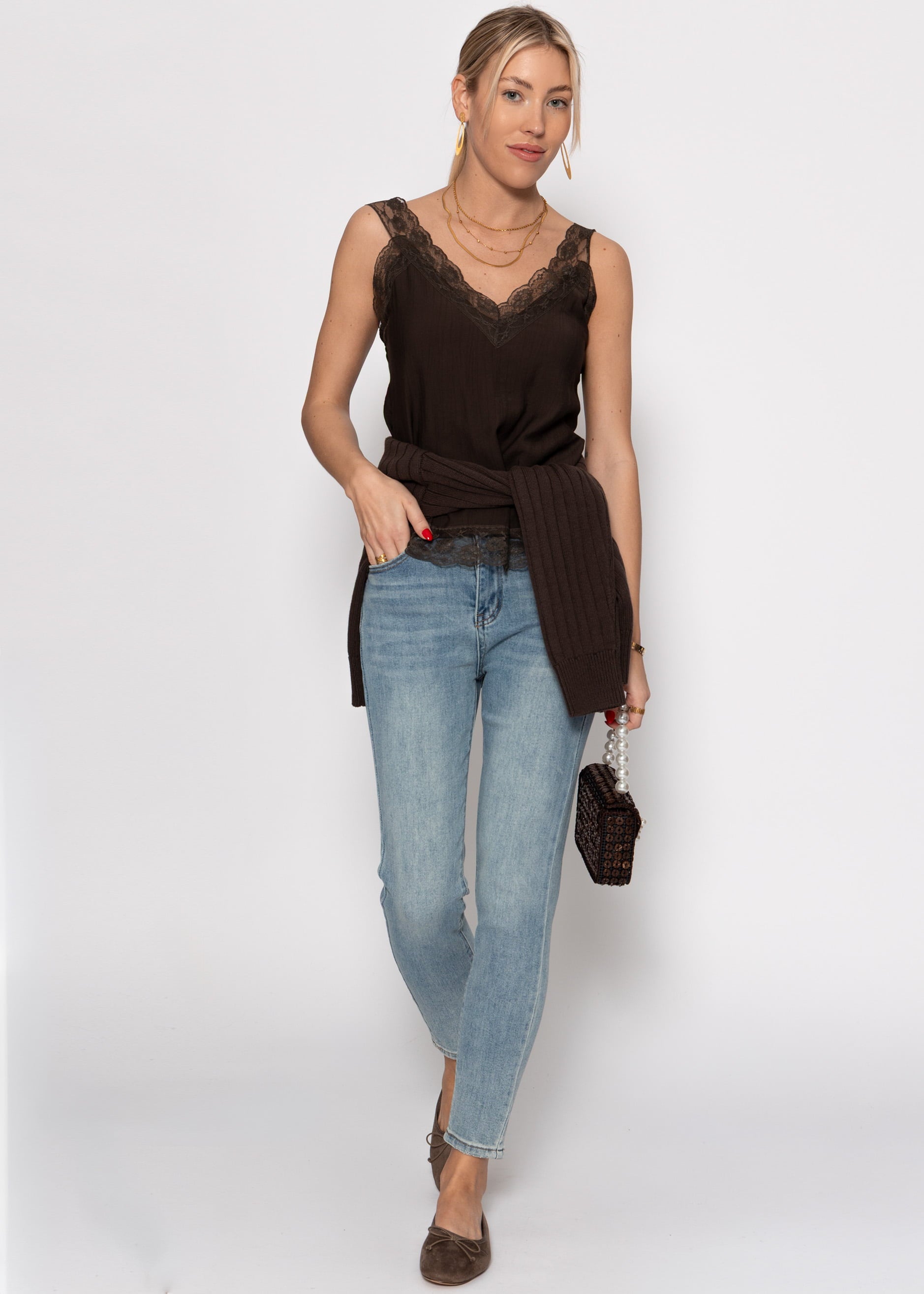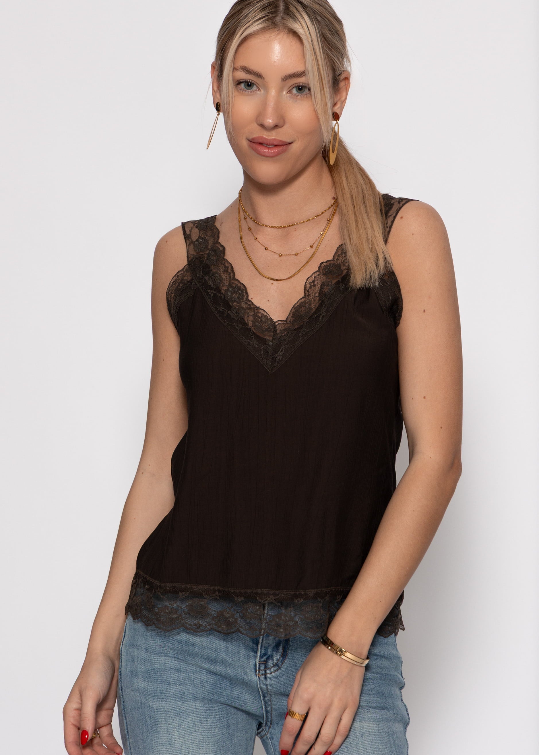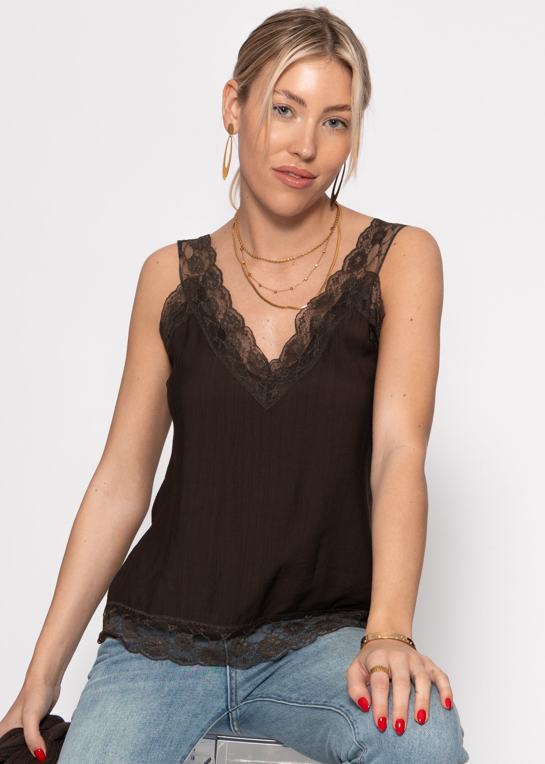 Viskose-Top in Braun mit femininem V-Ausschnitt und zarter Spitzenverzierung. Die feine Spitze entlang des Ausschnitts und am Saum verleiht dem Top einen edlen, leicht verspielten Look. Das fließende Material sorgt für eine leichte, angenehme Passform.